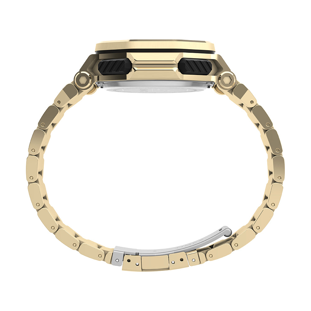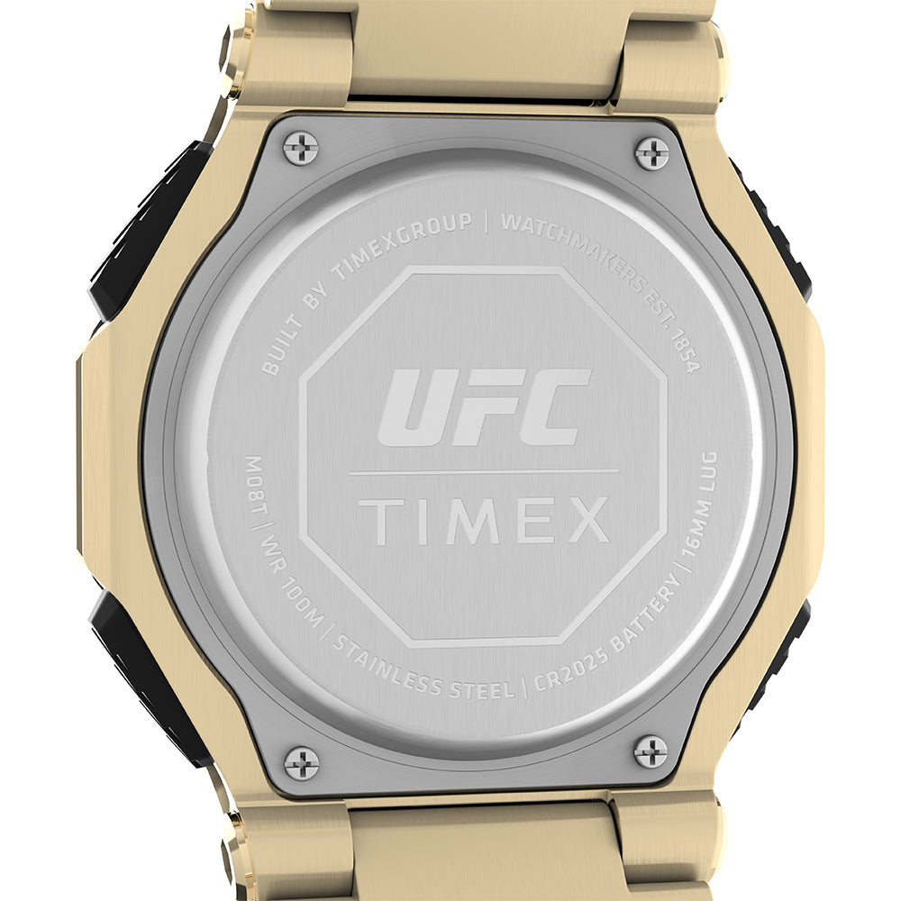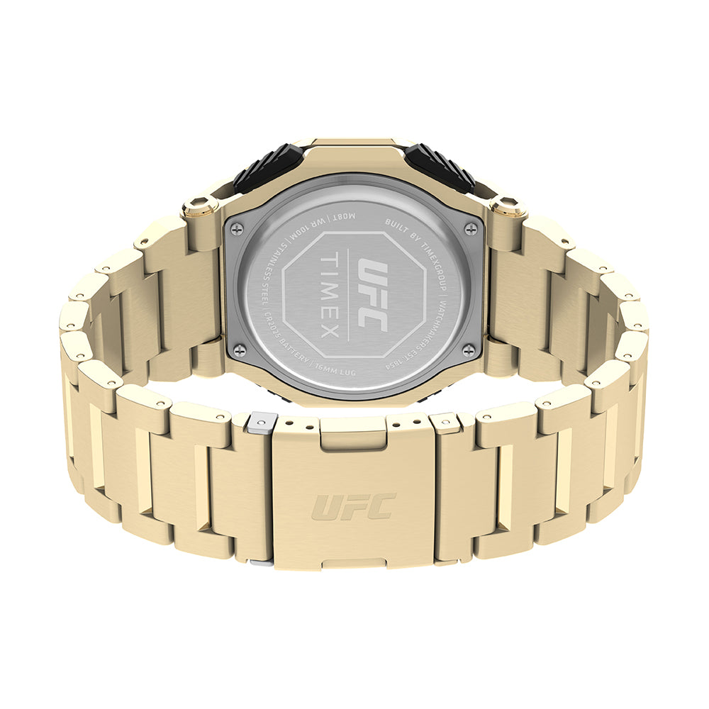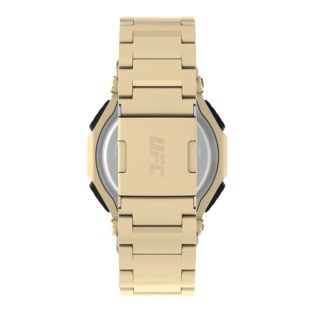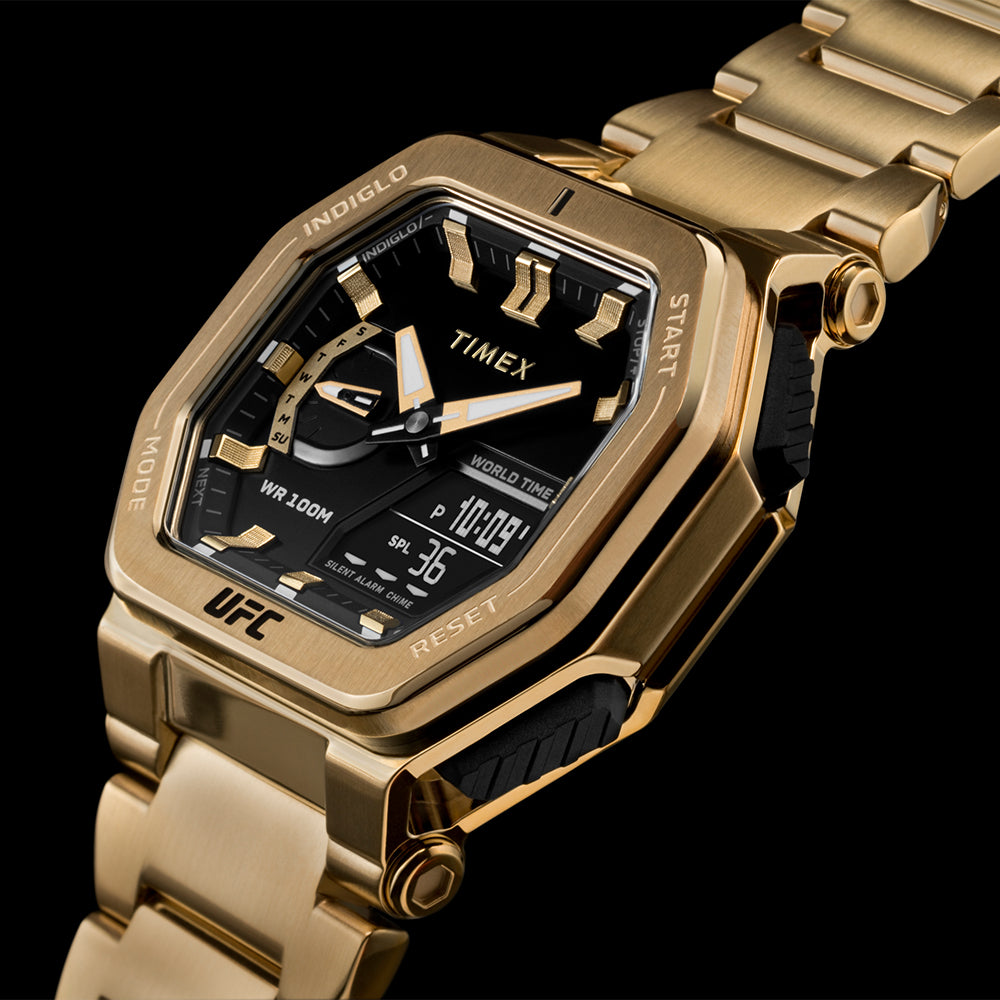 An absolute machine, the UFC Colossus comes equipped with the indestructible design and core timing features that fighters and fans need to compete at the highest level. Its custom analog-digital functionality includes a world time feature, alarm, calendar, and chronograph that level up its traditional mode of timekeeping. This watch is tough at all times thanks to its rugged 45mm gold-tone stainless-steel case, stainless-steel bezel, stainless-steel bracelet, and 100m water resistance rating. Luminous hands for night visibility team up with our revolutionary INDIGLO® backlight technology, so you can finish the challenge, no matter the conditions.?
