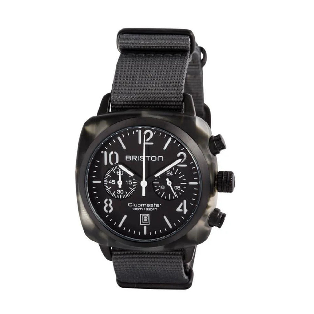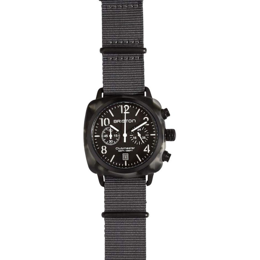 Black acetate case with a black nylon strap. Fixed black stainless steel bezel. Black dial with black hands and Arabic numeral & index hour markers. Minute markers around the outer rim. Dial Type: Analog. Luminescent hands and markers. Date display at the 6 oclock position. Chronograph - two sub-dials displaying: 60 second and 24 hour. Miyota Caliber OS21 quartz movement. Scratch resistant mineral crystal. Pull / push crown. Solid case back. Cushion case shape, case size: 40 mm. Band width: 20 mm. Buckle clasp. Water resistant at 100 meters / 330 feet. Functions: chronograph, date, GMT, second time zone, hour, minute, second. Clubmaster Series. Fashion watch style. Watch label: Japan Movt. Briston Clubmaster Black Dial Mens Watch 15140.PBAM.GT.3.NG.