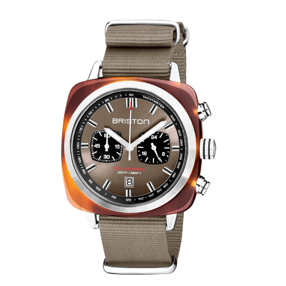Clubmaster Sport chronograph watch, 42 mm. Steel and tortoiseshell acetate case. Grey taupe sunray dial. Chronograph, date, 2 counters. 60-minute counter at 9 o'clock, 24-hour counter at 3 o'clock. Hands with white Superluminova® luminescent inserts. Domed mineral crystal. Exclusive Briston interchangeable strap: grey taupe with polished steel buckles. Miyota OS21 quartz calibre.