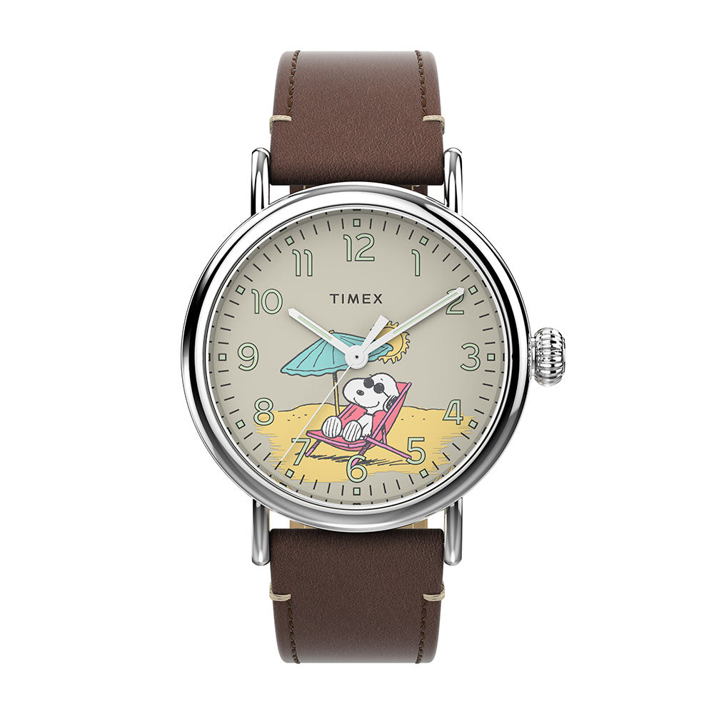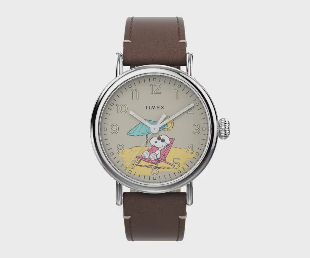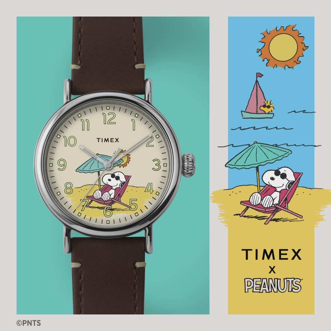 The good life! Our most refined everyday watch meets our favorite Peanuts pup. We updated our versatile Timex Standard pairing the silver-tone case and brown leather strap with our pal Snoopy on the dial to enjoy sweet summertime.