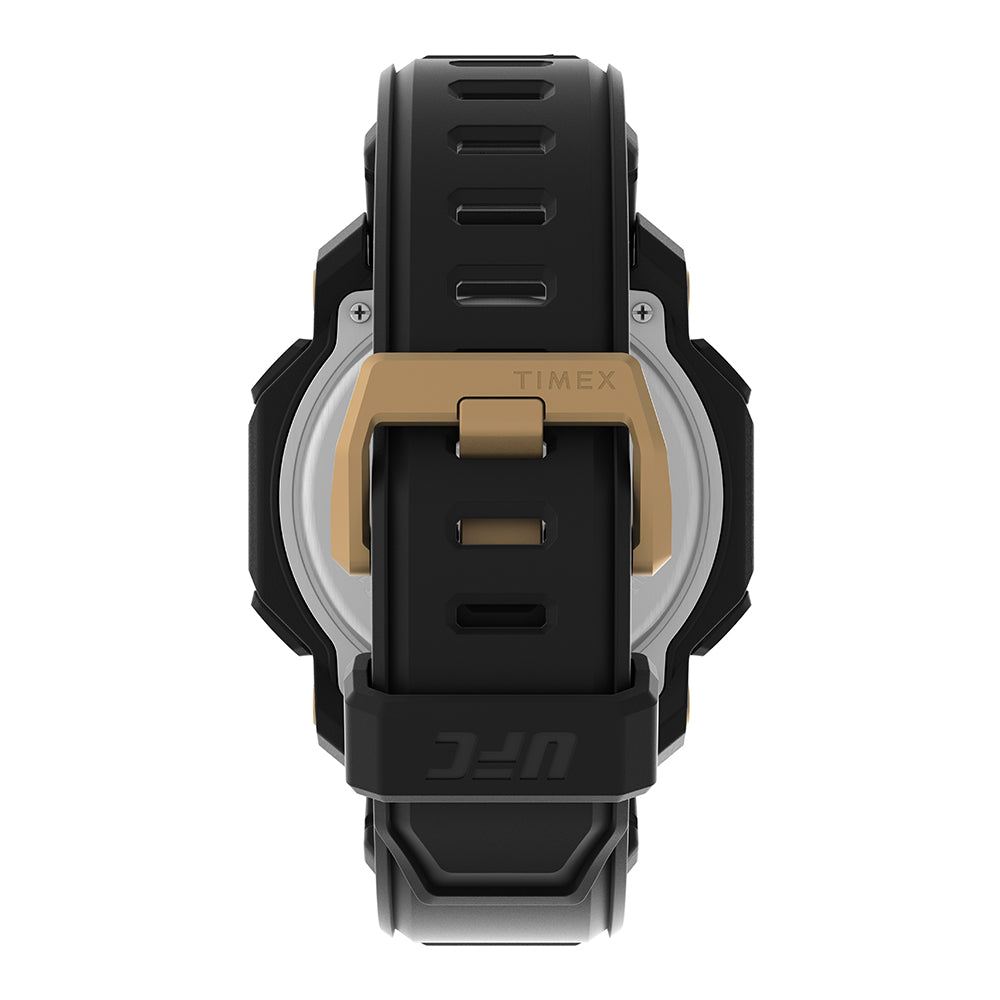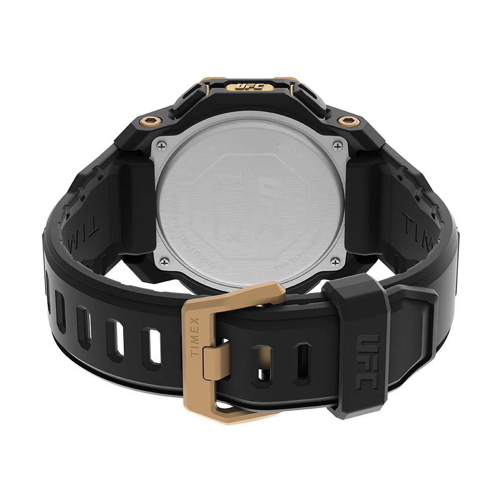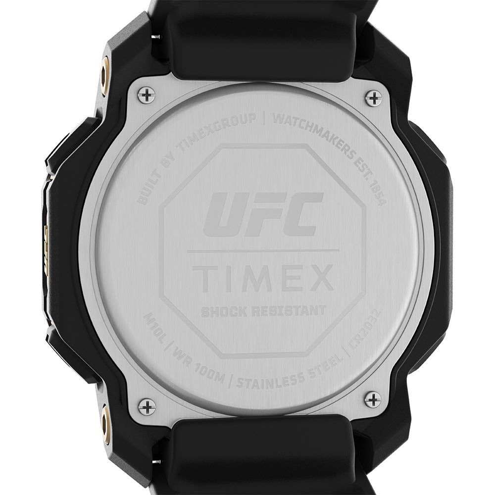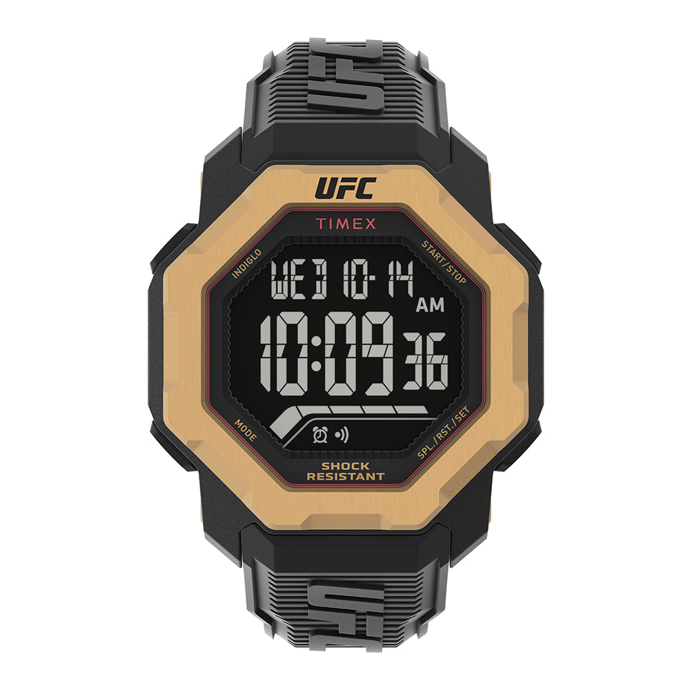 The UFC Knockout is a timepiece for fighters and fans alike. Its shock-resistant construction makes it tough enough to withstand any intense training session or fight, and it?s built with a 49mm resin case with a stainless-steel bezel that provides ultimate durability and style. The vertical brushed gold-tone bezel adds a touch of sophistication while the black rugged resin strap ensures a comfortable fit. This watch also boasts a custom UFC 5-minute round timer, chronograph and alarm functions, 100m of water resistance, red INDIGLO® backlight, and ?93? on its side as a subtle nod to the origins of the UFC.?