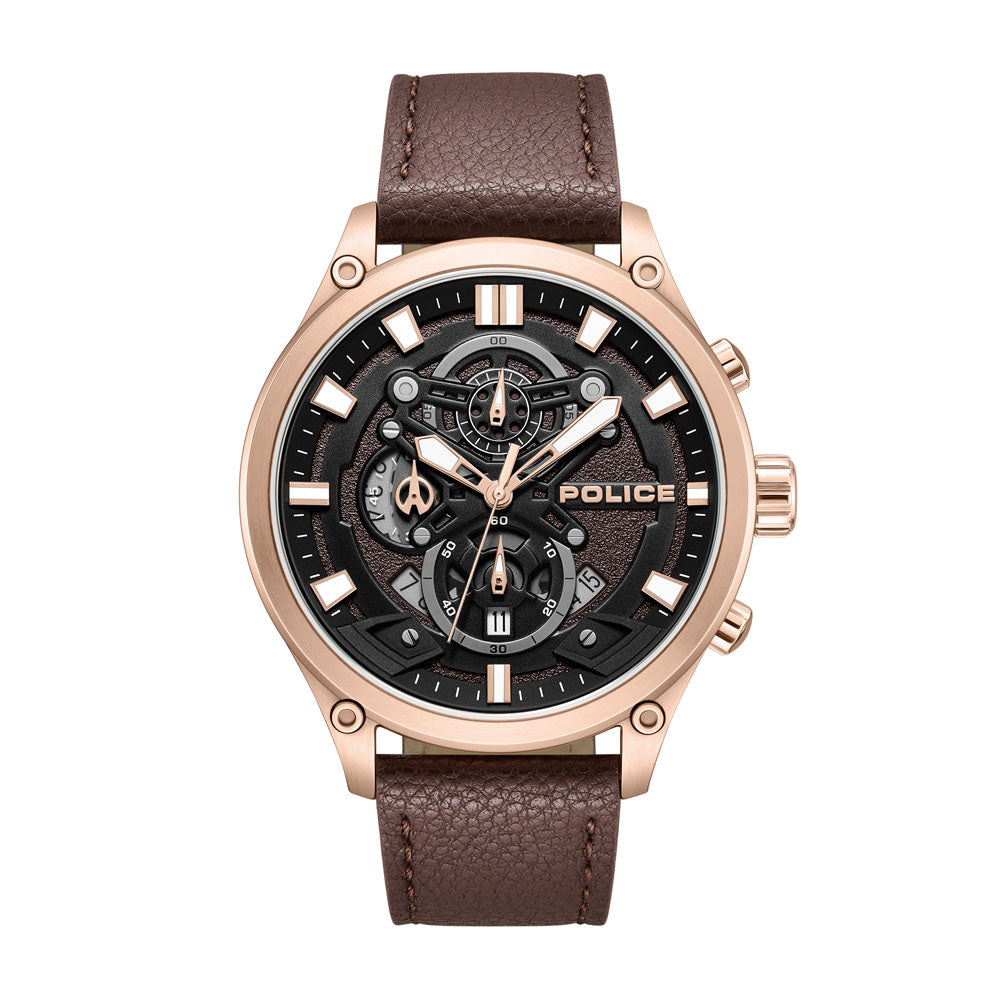 For the gentleman with a taste for modern, edgy style, Wadden – a chronograph watch captures the essence of POLICE in every detail. Its oversized 46mm IP rose gold case and screw-detailed dial, rose gold hour markers and hands with white-filled contrast details beautifully with the dark brown and black backdrop. The signature at 3 o’clock adds a final touch, complemented by the premium dark brown leather strap with tonal stitching—designed to exude confidence with every wear.