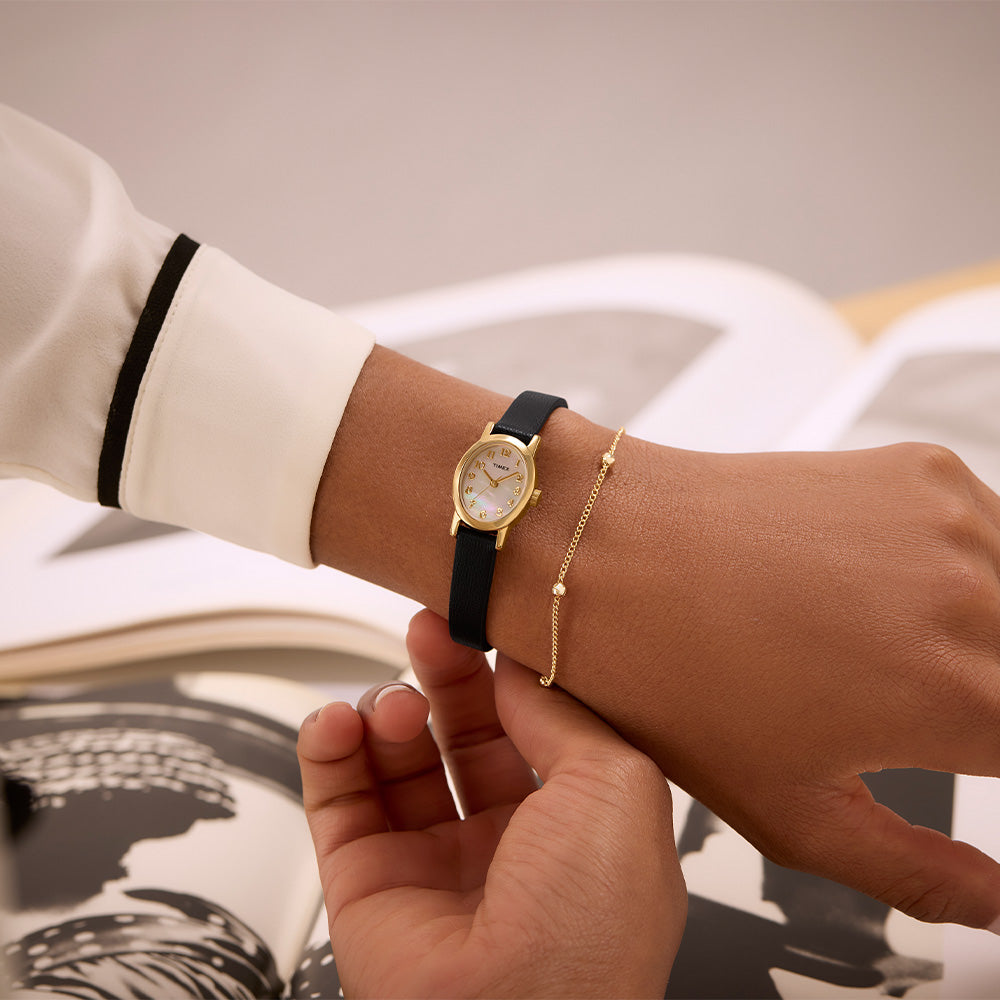 Our Cavatina remains faithful to its petite roots with a polished gold-tone 18mm case in a classic oval shape that whispers a timeless elegance on the wrist. We’ve updated it with an iridescent mother-of-pearl dial that shimmers with your every movement and a black petite tapered leather strap with a smooth grain that's as on-trend as it is timelessly stylish.