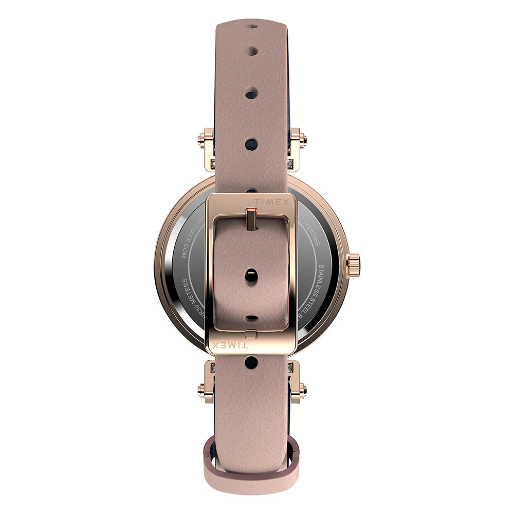 Enjoy the versatility of 2 watches in 1! Simply rotate the smooth grain leather strap at the lug to reveal a different color on the reverse side. No matter which color strap you choose, this timepiece shines with crystal accents adorning its lugs, a beautifully textured dial, and a sleek 31mm case size that exudes contemporary charm.