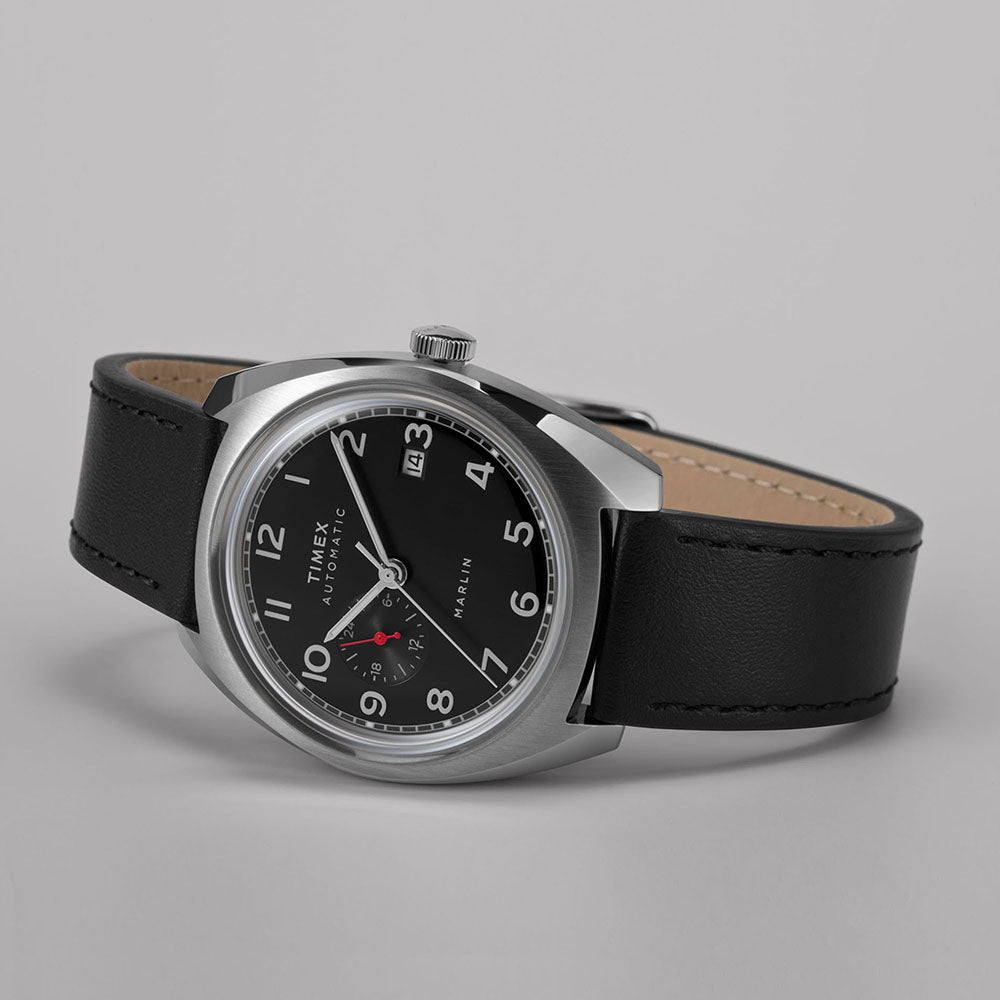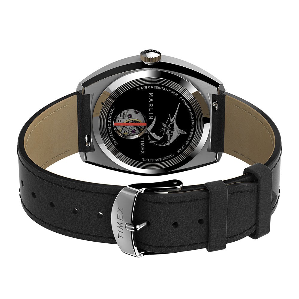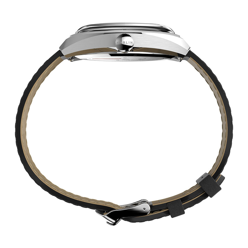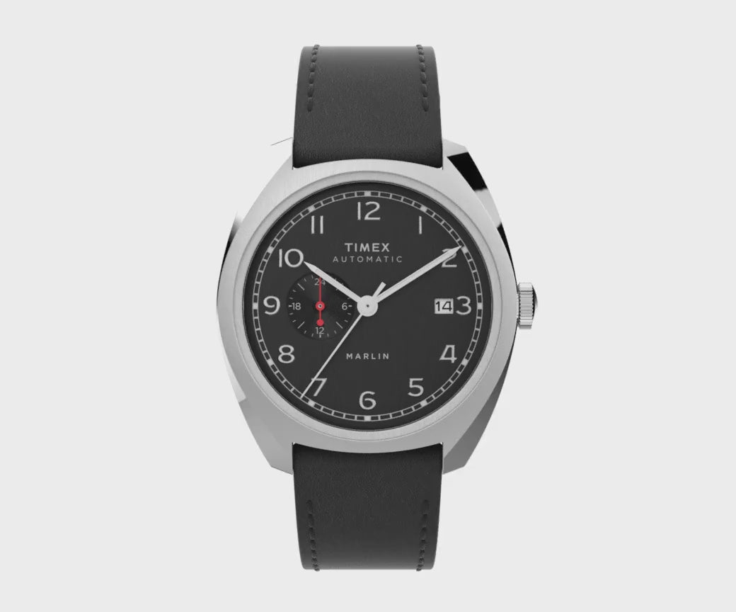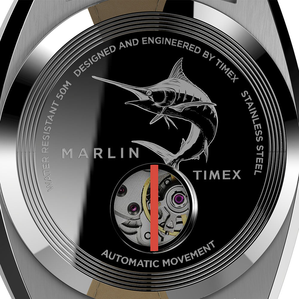 The Marlin Automatic Sub-Dial brings a modern-retro update to our 1960s Marlin. Pops of brilliant blue and riveting red highlight its sleek design, creating a contemporary style that's sharp enough for any outing. Sophisticated details abound, including a full Arabic dial, date feature, 24-hour format sub-dial at the 9 o'clock position, and a stainless-steel case in a curved cushion shape. The Japanese automatic movement is showcased through an exhibition case back which bears the Marlin name and a detailed etching of the iconic marlin fish. The full Marlin name also graces the dial and crown to honor not only our watchmaking legacy, but the ever-evolving style of this suave 60s icon.