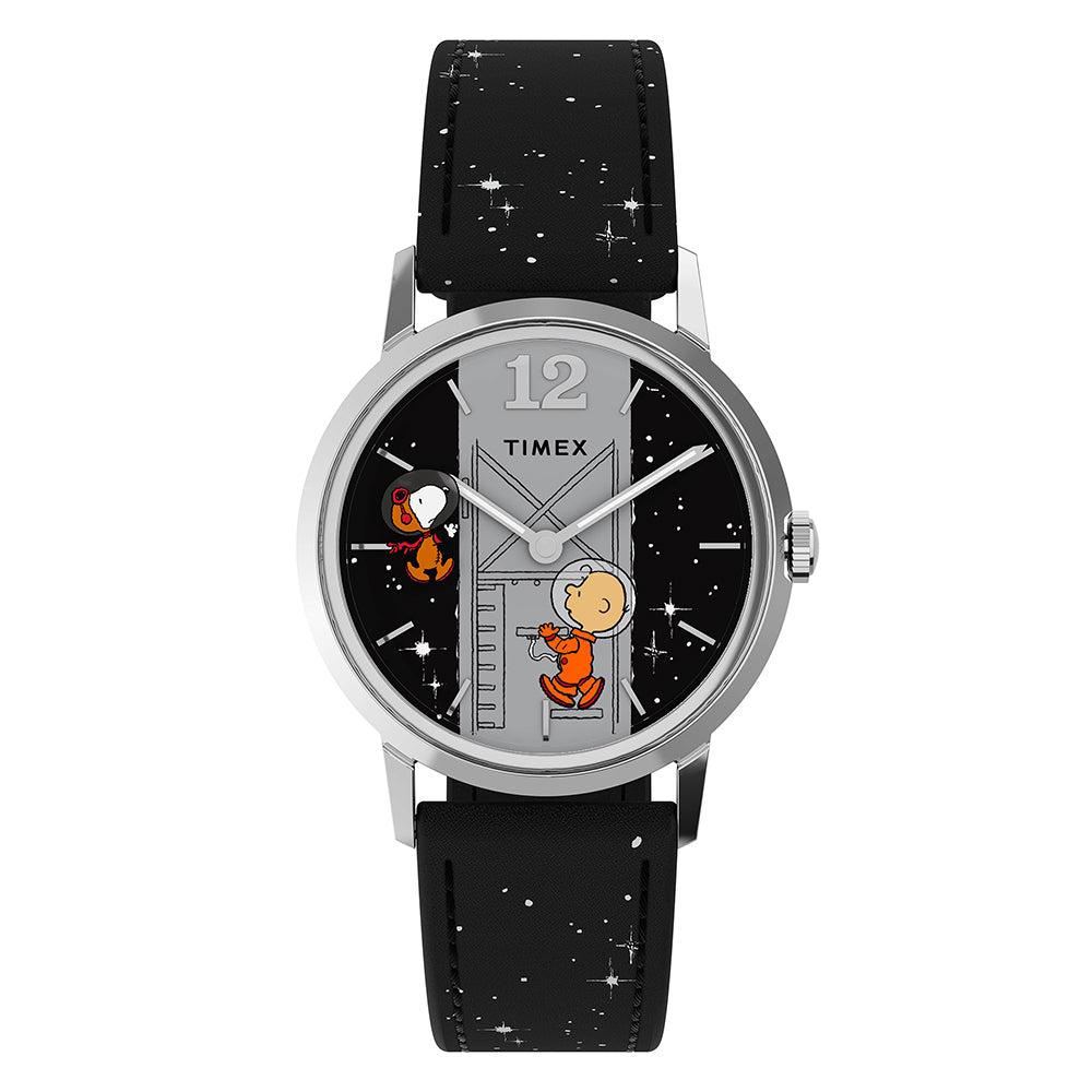 Inspired by mankind’s leap into the cosmos, the Timex x Peanuts Space Collection brings Snoopy and Charlie Brown to a whole new frontier. Thanks to its clever design, the sweep second hand design allows you to watch Snoopy float and glide around the graphic dial, capturing the magic of zero gravity right on your wrist. We’ve paired this fun update to our Marlin Hand-Wound with a smooth grain black vegan leather strap scattered with stars, luminant hands, a domed acrylic crystal, and a 34mm polished recycled stainless-steel case. Perfect for adding a bit of nostalgia and wonder to your everyday style, this adorable watch is a celebration of adventure, imagination, and the joy of dreaming big.