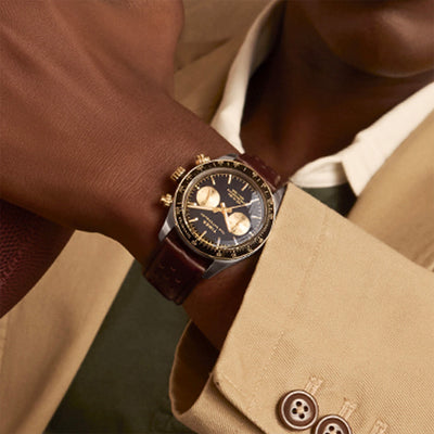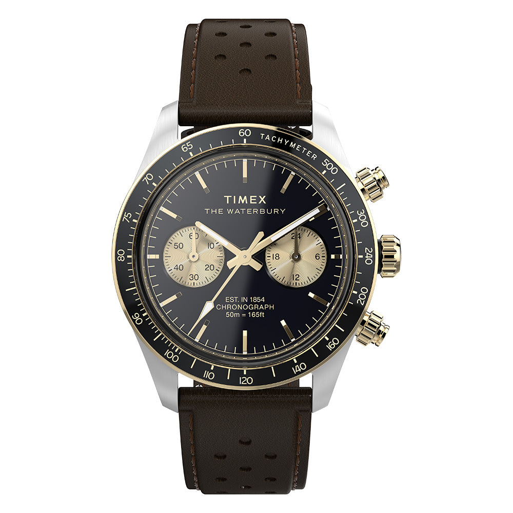 The Waterbury Heritage Chronograph combines modern functionality with timeless design, featuring a chronograph to track elapsed time and a black tachymeter bezel for determining average speed. Encased in a robust 39mm stainless-steel case with vertical brushing, the black dial is accented by contrasting sub-dials and safeguarded by an anti-reflective mineral glass crystal. Luminant hands ensure enhanced visibility, while applied indices and intricate detailing on the crown and pushers add a refined touch. Versatility is key, with a brown natural leather strap that’s perforated for breathability.