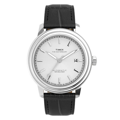 Defined by sharp lines and sweeping curves, the Waterbury Automatic features an enhanced 41mm stainless-steel case with an elegant two-tiered bezel. Encircling the silver-white dial are beveled markers and a rail track, paired with a sleek handset and a date window sitting beside the third hour marker. This sophisticated timepiece is paired with a black natural leather strap ethically sourced from the Leather Working Group (LWG), complete with an enticing crocodile grain and a deployant clasp.