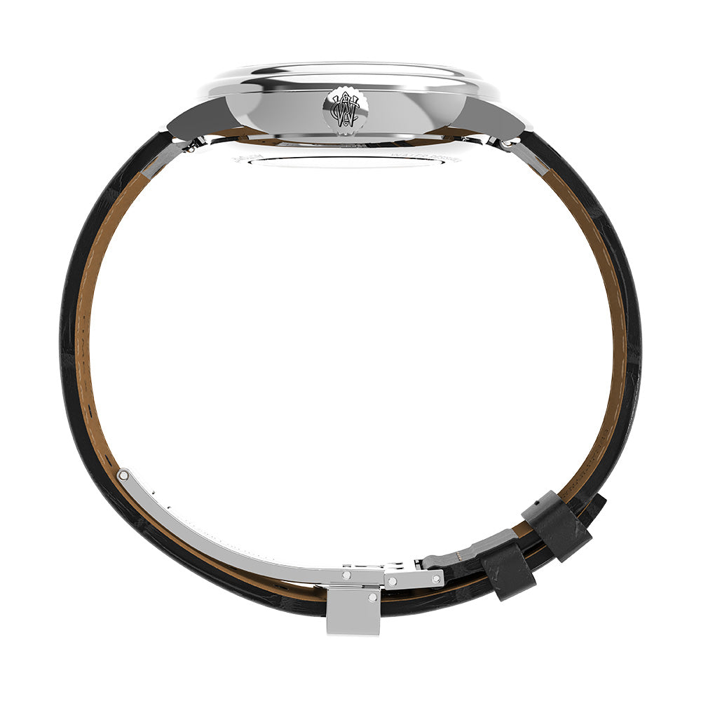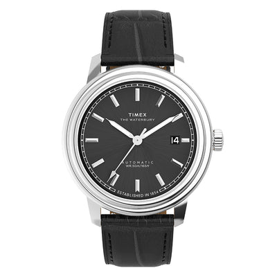 Defined by sharp lines and sweeping curves, the Waterbury Automatic features an enhanced 41mm stainless-steel case with an elegant two-tiered bezel. Encircling the black or silver-white dial are beveled markers and a rail track, paired with a sleek handset and a date window sitting beside the third hour marker. This sophisticated timepiece is paired with a black natural leather strap ethically sourced from the Leather Working Group (LWG), complete with an enticing crocodile grain and a deployant clasp.