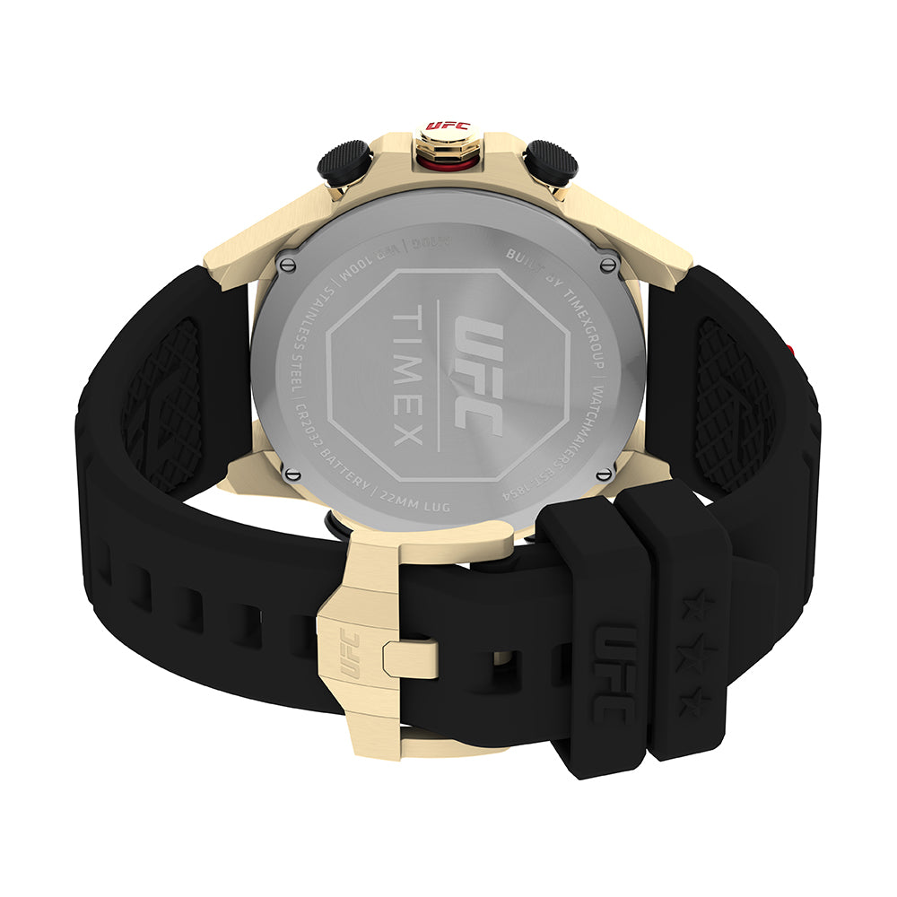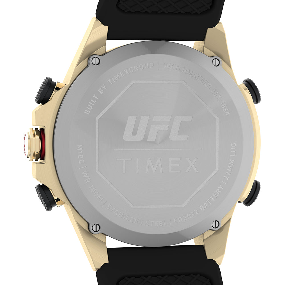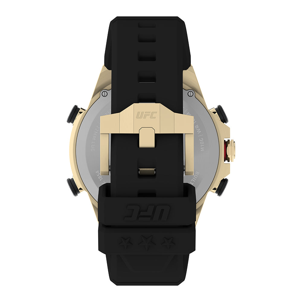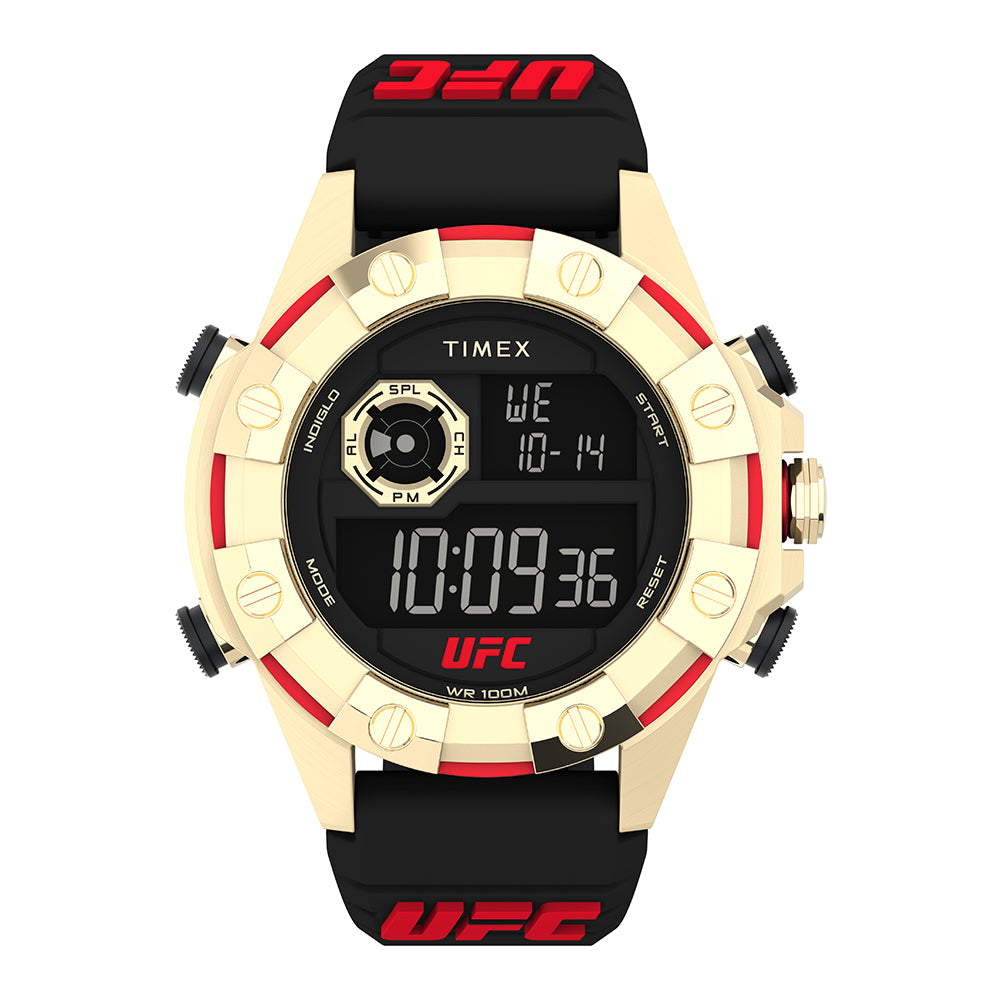 Step into the octagon with the UFC Kick Digital. This timepiece packs a punch with its substantial 49mm stainless-steel case and bezel, along with a rugged black silicone strap that's built to last. Featuring an octagonal sub-dial with alarm, split, chronograph, and AM/PM feature indicators, it?s perfect for keeping track of time whether it?s a?training or rest day. This watch is?also built with a countdown timer for timing workouts and ensuring optimal performance. Plus, it has an INDIGLO® backlight and 100m of water resistance, making it the perfect matchup no matter the time or the place.?