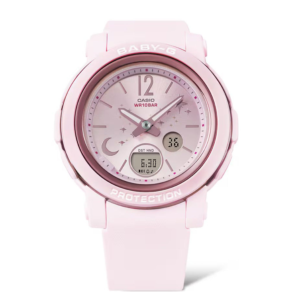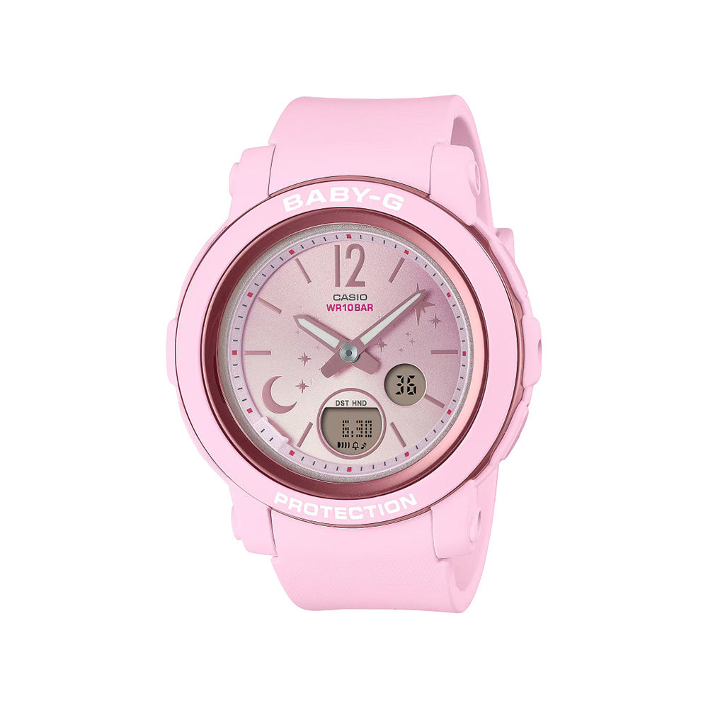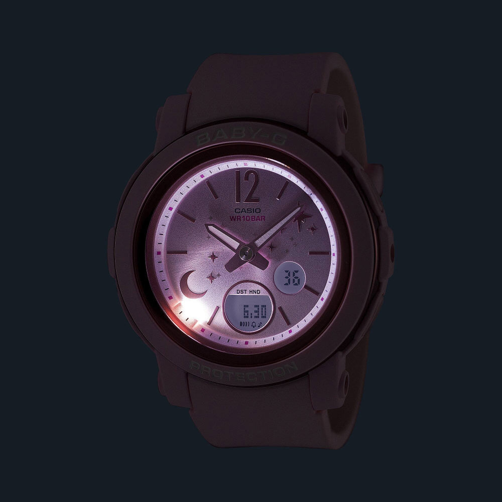 Calling all stargazers! Immerse yourself in the twinkle of the stars and the glow of the moon. The compact BGA-290 features an easy-to-read wide face in a gradation of color evoking the night sky. The bezel ring is finished with vapor deposition for a beautiful metallic shine. Night sky details signify good fortune with the moon for growth and stars for happiness. With shock-resistant construction and water resistance up to 100 meters, this timepiece is as practical as it is charming. Just tilt your wrist and watch it sparkle.