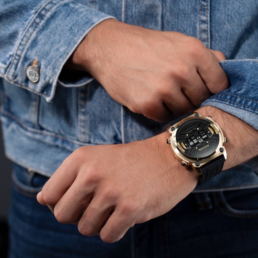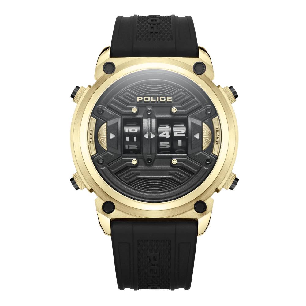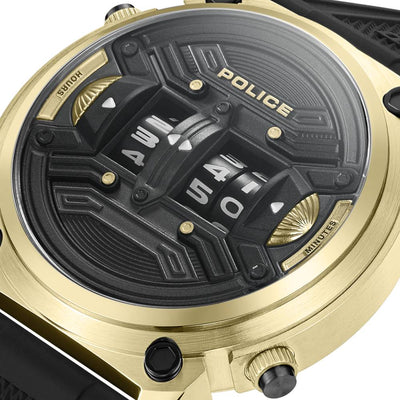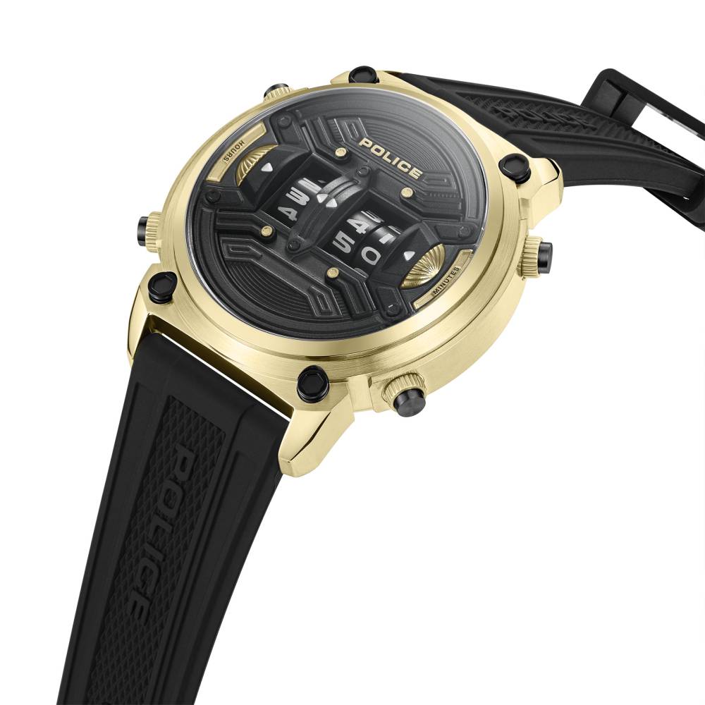 A bold design, the Police Rotor timepiece breaks all the rules of traditional watch design. The standalone design with the rotor dial is flanked by an IP gold case. Complete with a sturdy black silicone strap, every element of the Rotor makes it a league of its own.