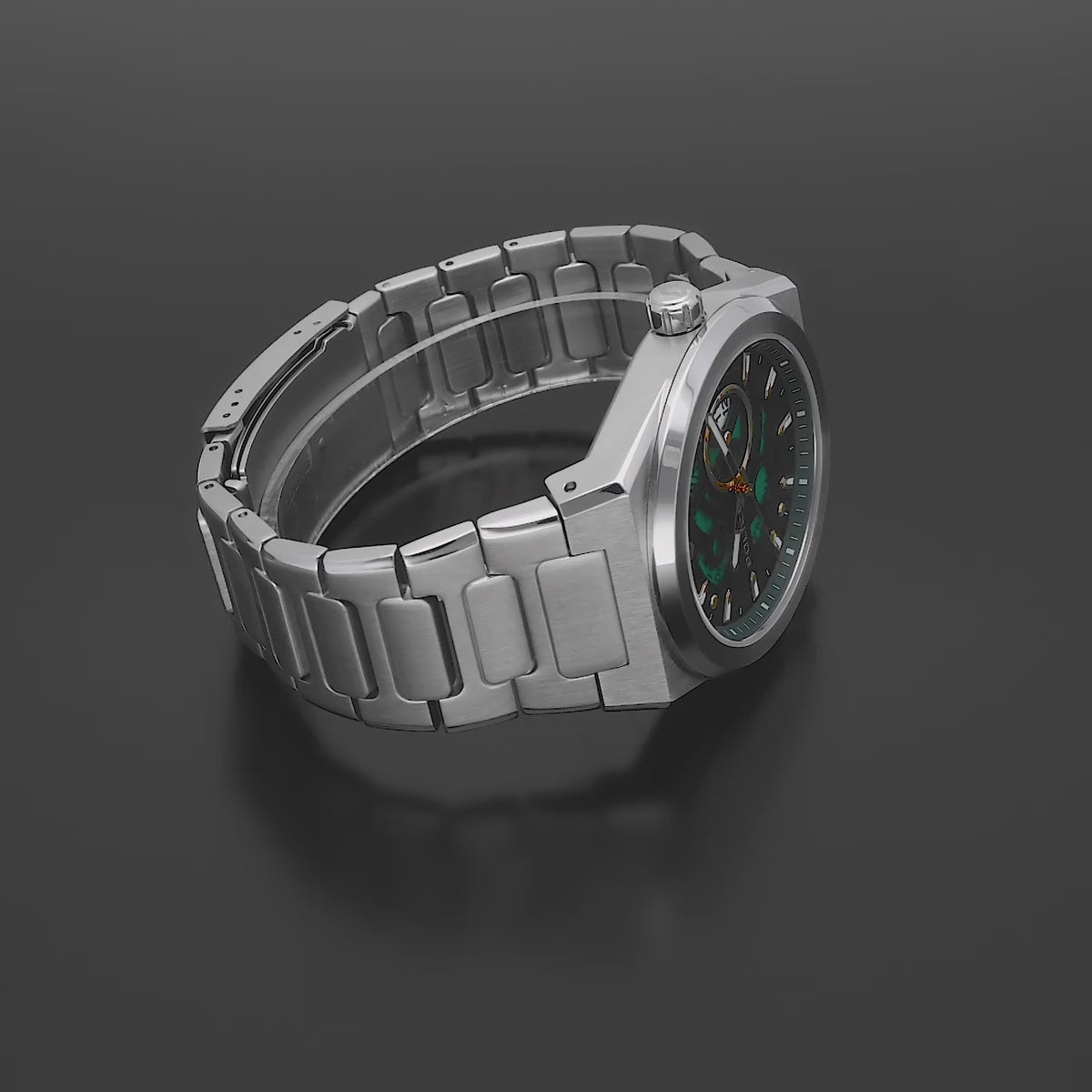 Remaining faithful to its masculine essence, Ofset strikes a balance between power and urban sophistication, adding an extra touch of swagger to its style. Witness time through its translucent rich green dial, revealing a date disc and bold detailing. Finishing off with flair, the push-button stainless steel bracelet comfortably rests on the wrist, commanding attention.