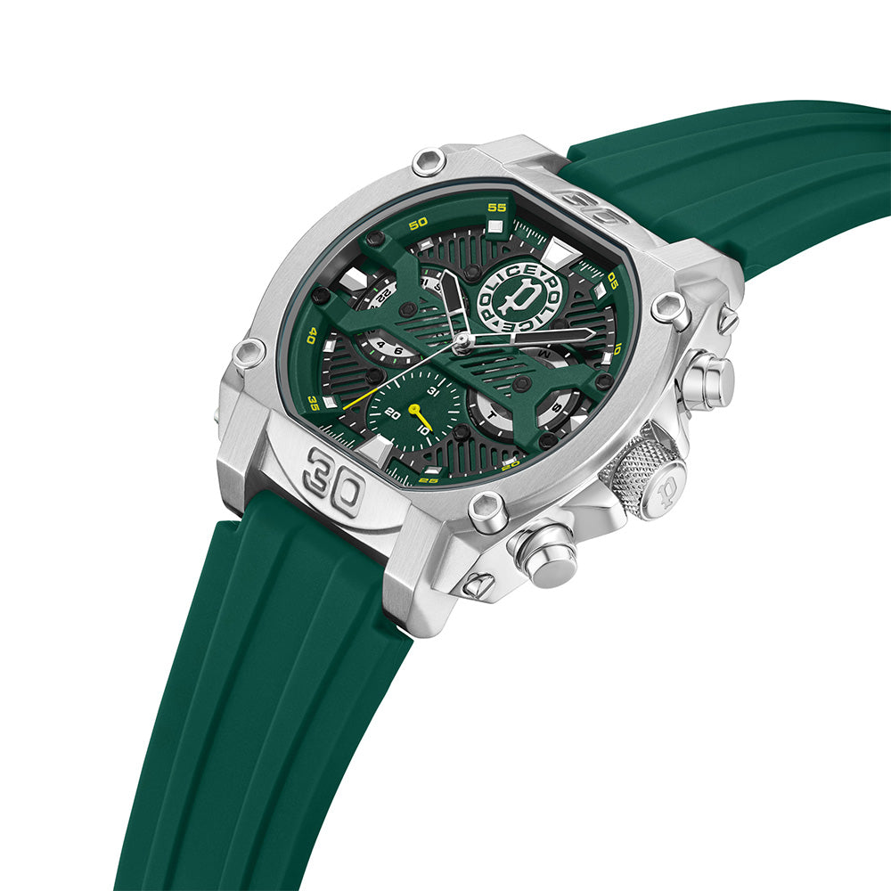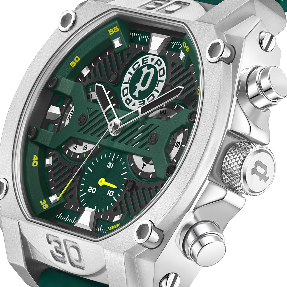 If you identify most with bold sophistication, then Norwood from Police is your perfect match. Embracing a rebellious character, showcased by the distinctive case shape and the prominent bezel screws, this multifunction watch unmistakably embodies the essence of POLICE. Taking a bolder turn with its distinctive green & black sunray dial, accentuated by bold details and an industrial design, the watch amplifies its daring allure. The durable green silicone strap is an ideal addition for anyone seeking to add an edge to their outfit.