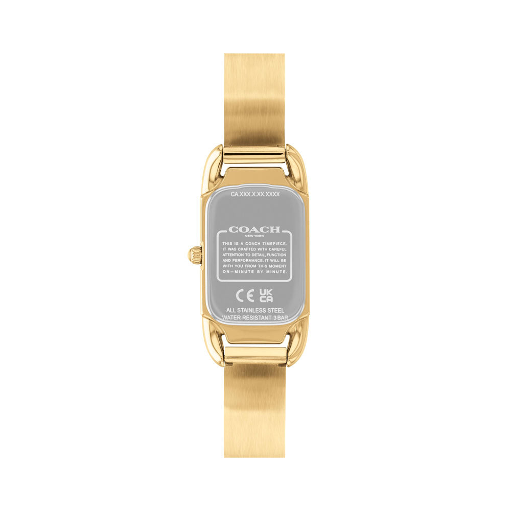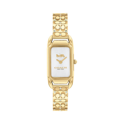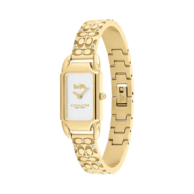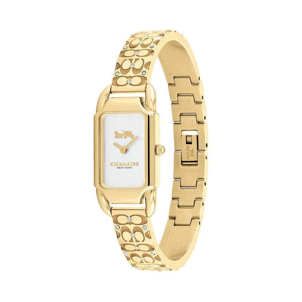 Inspired by the sleek designs of 1920s Art Deco, the Cadie watch has an elegant long and lean silhouette. The gold tone timepiece features a translucent enamel bangle bracelet etched with the Coach Signature. It?s detailed with Coach?s iconic Horse and Carriage motif on the silver white dial.