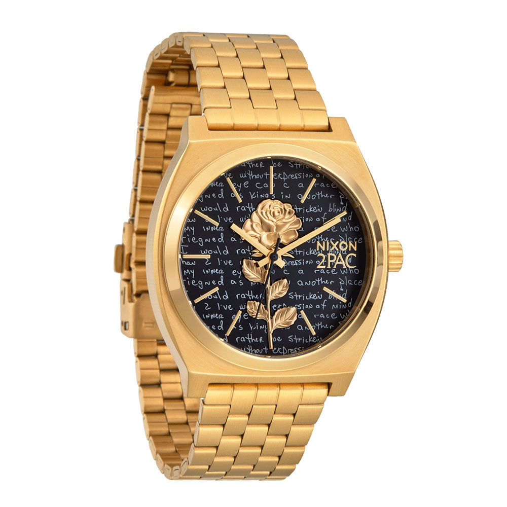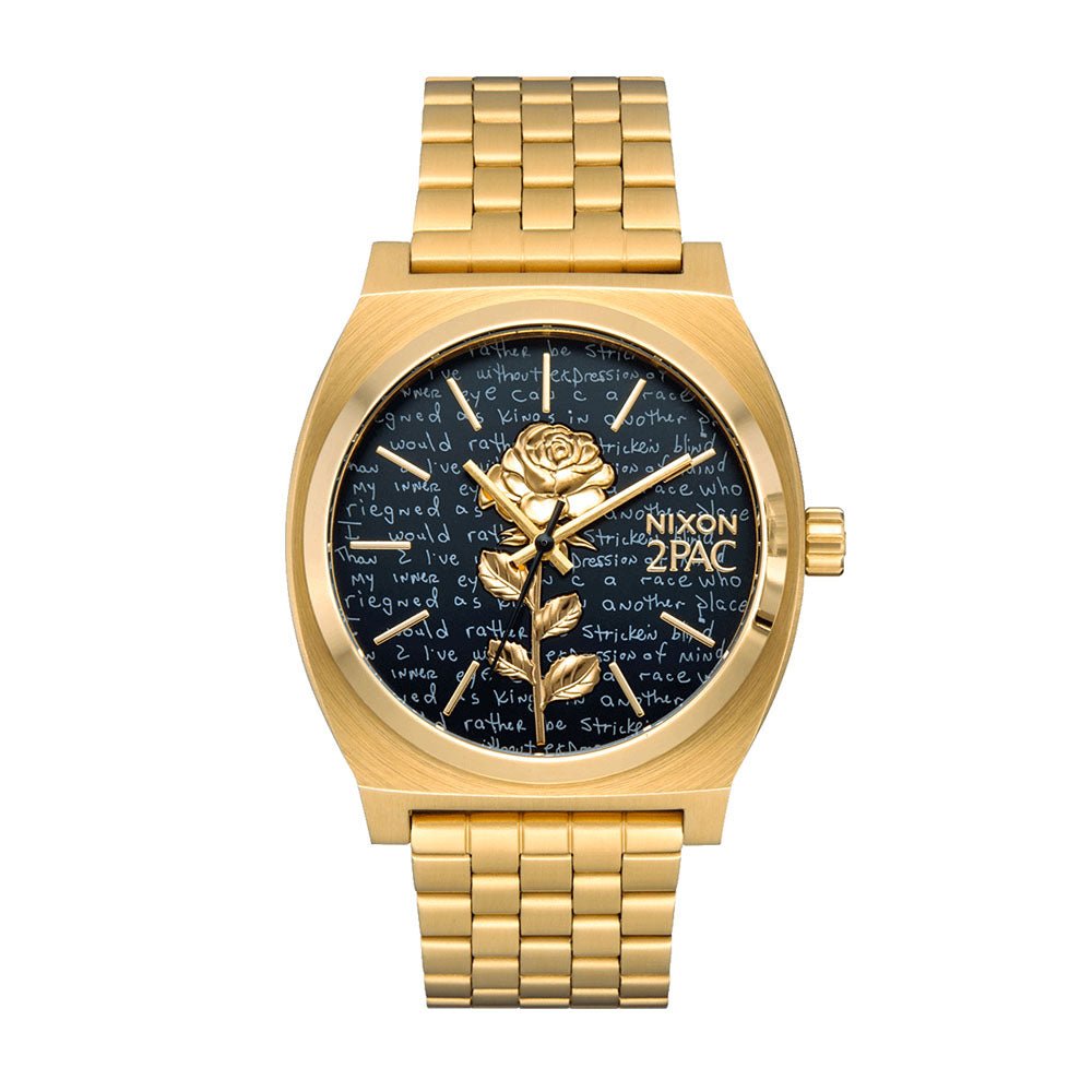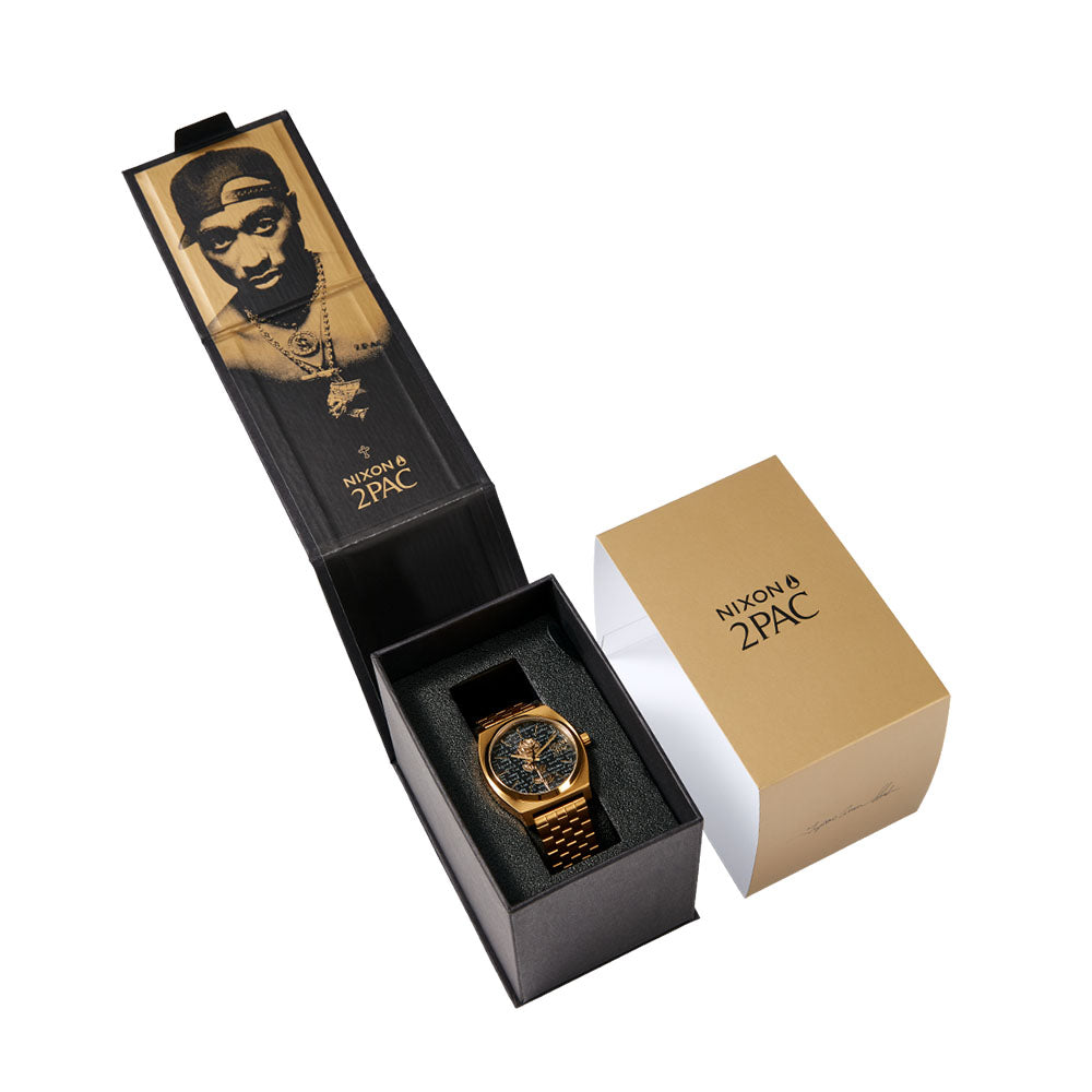 Inspired by 2PAC's iconic style that transcended into street culture, the 2PAC Time Teller gets a gold and all black look with a custom embossed and printed dial. A gold rose, handwritten poetry and a perfect balance of black and gold.