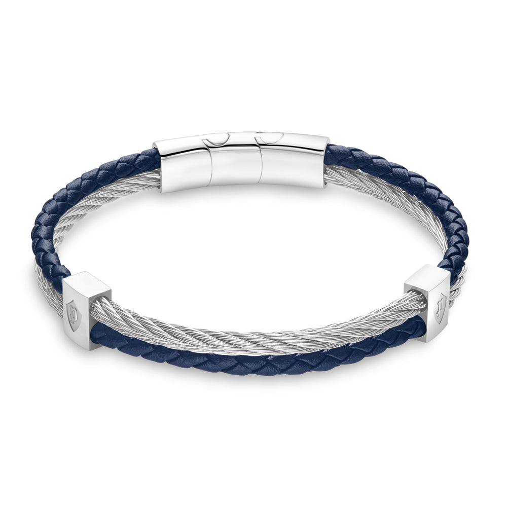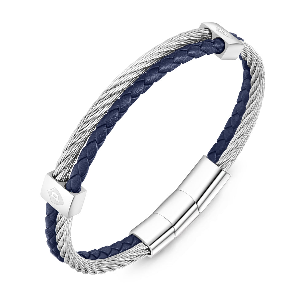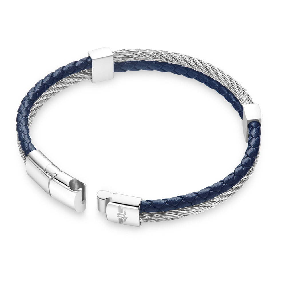 Whatever your style, Police men's Kingpins is a knockout bracelet that will take the wearer's personality. The bold details make this shiny stainless steel mixed cable paired with the navy blue leather bracelet bold, sophisticated, and a statement piece.