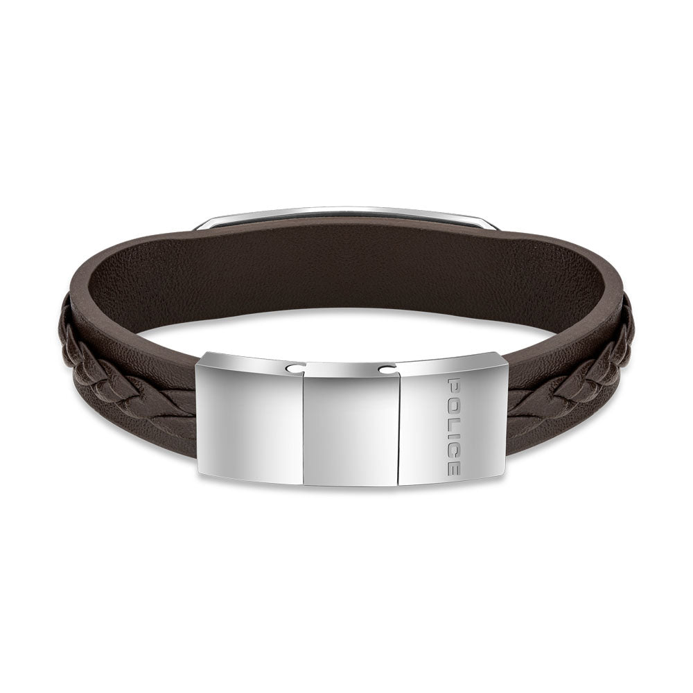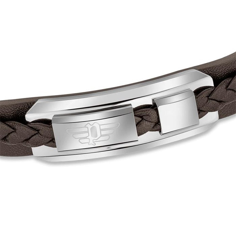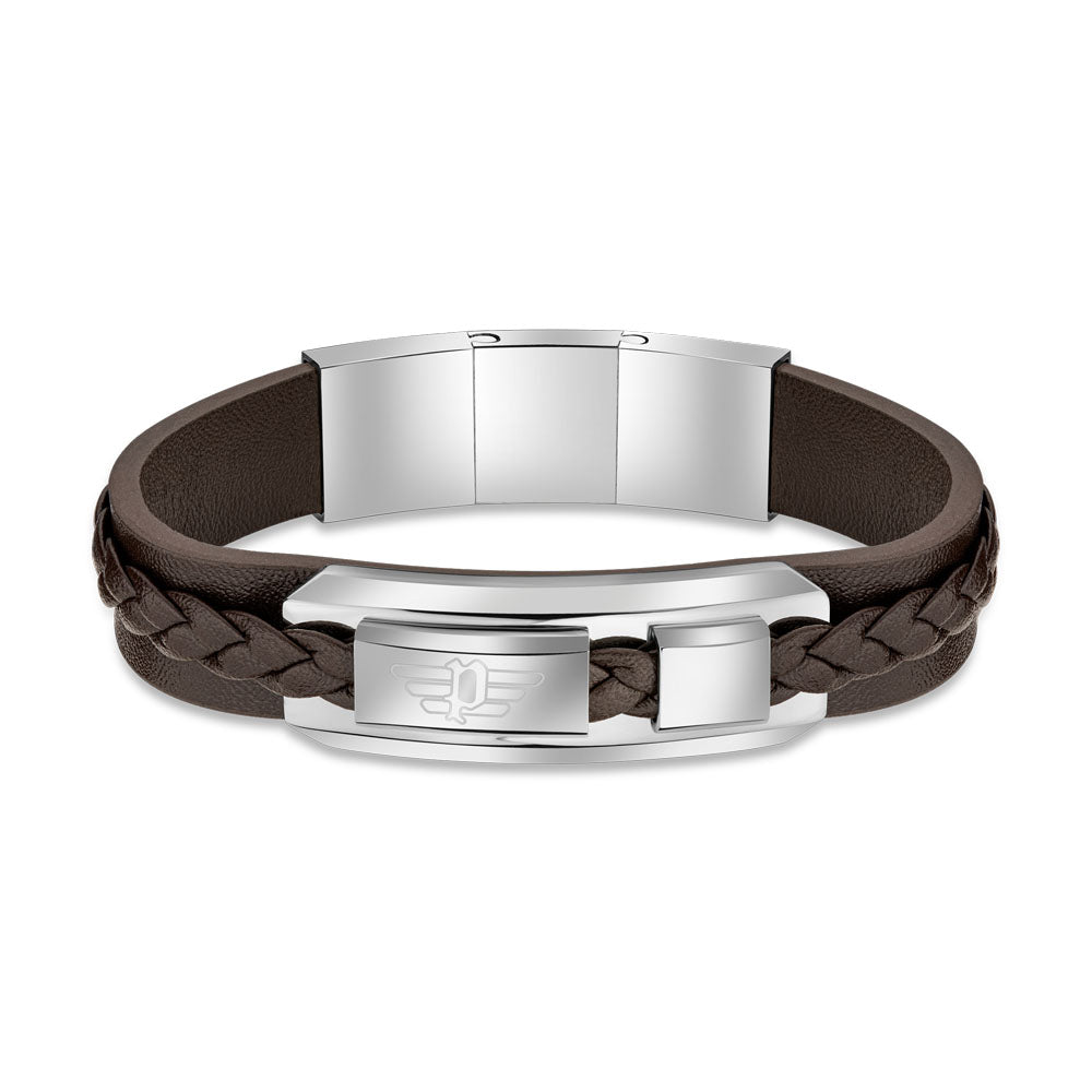 A bracelet for men in casual style. On the brown leather bracelet there is another braided leather strap and a stainless steel jewellery element bearing the brand logo. The magnetic fastener ensures a good hold on the wrist. One of the elements can be removed so that the length of the bracelet can be shortened. The bracelet can also be customised with an engraving on the front of the clasp.