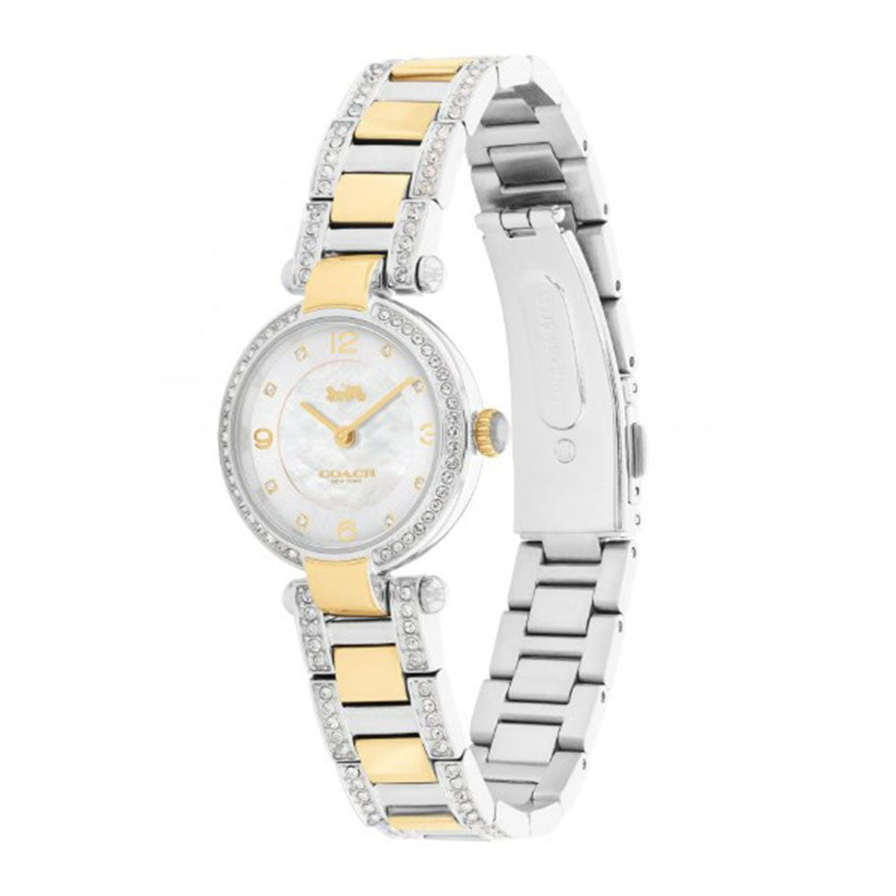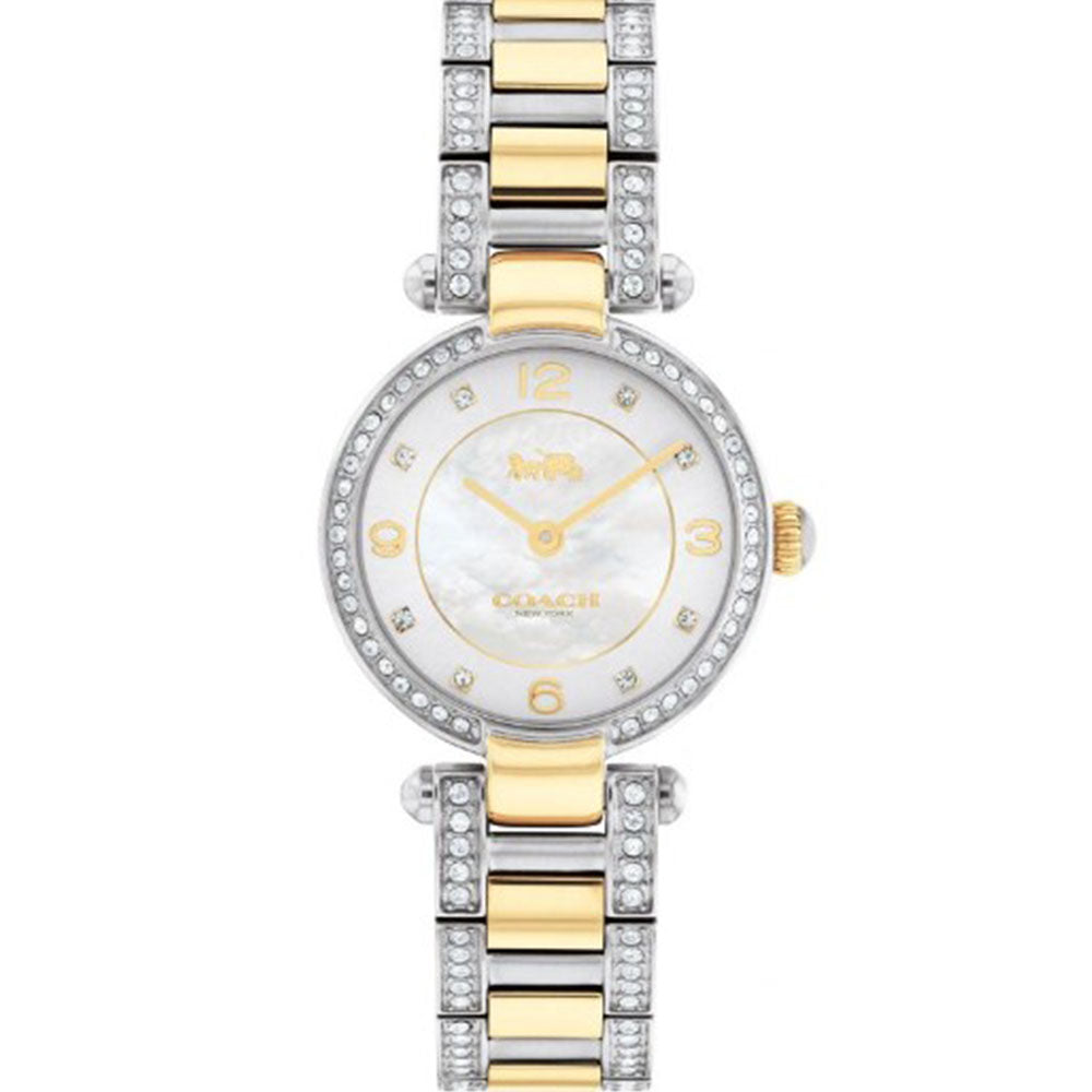 Timeless and elegant, the Cary watch is a sophisticated style perfect for day or night. The stainless steel and gold tone bracelet design shimmers with crystals and features a luminous mother-of-pearl dial with the iconic Coach Horse and Carriage motif for a heritage touch. --Stainless steel and gold tone case and bracelet