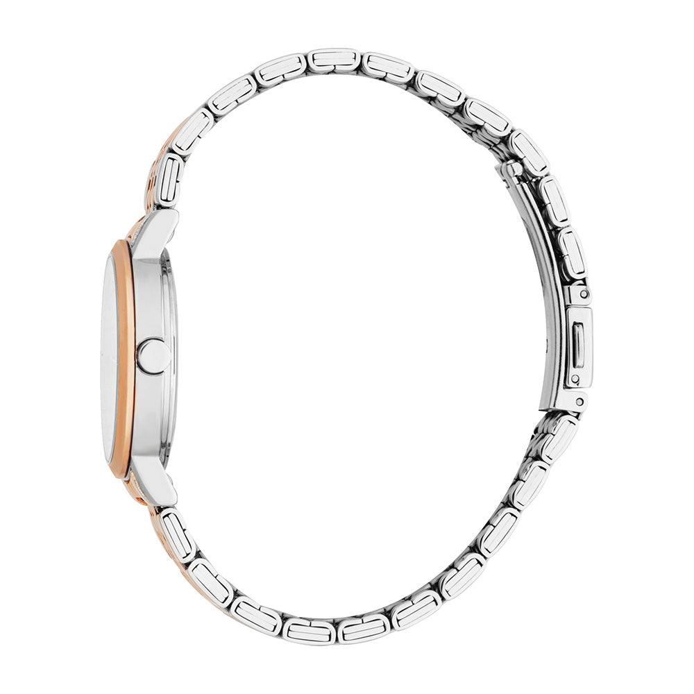 Mother of Pearl Dial in a captivating Two-Tone Rose Gold and Silver Strap ? a graceful dance of elegance and modern allure. The iridescence of the Mother of Pearl dial seamlessly complements the dynamic tones of rose gold and silver on the strap, creating a coordinated ensemble that captures attention.
