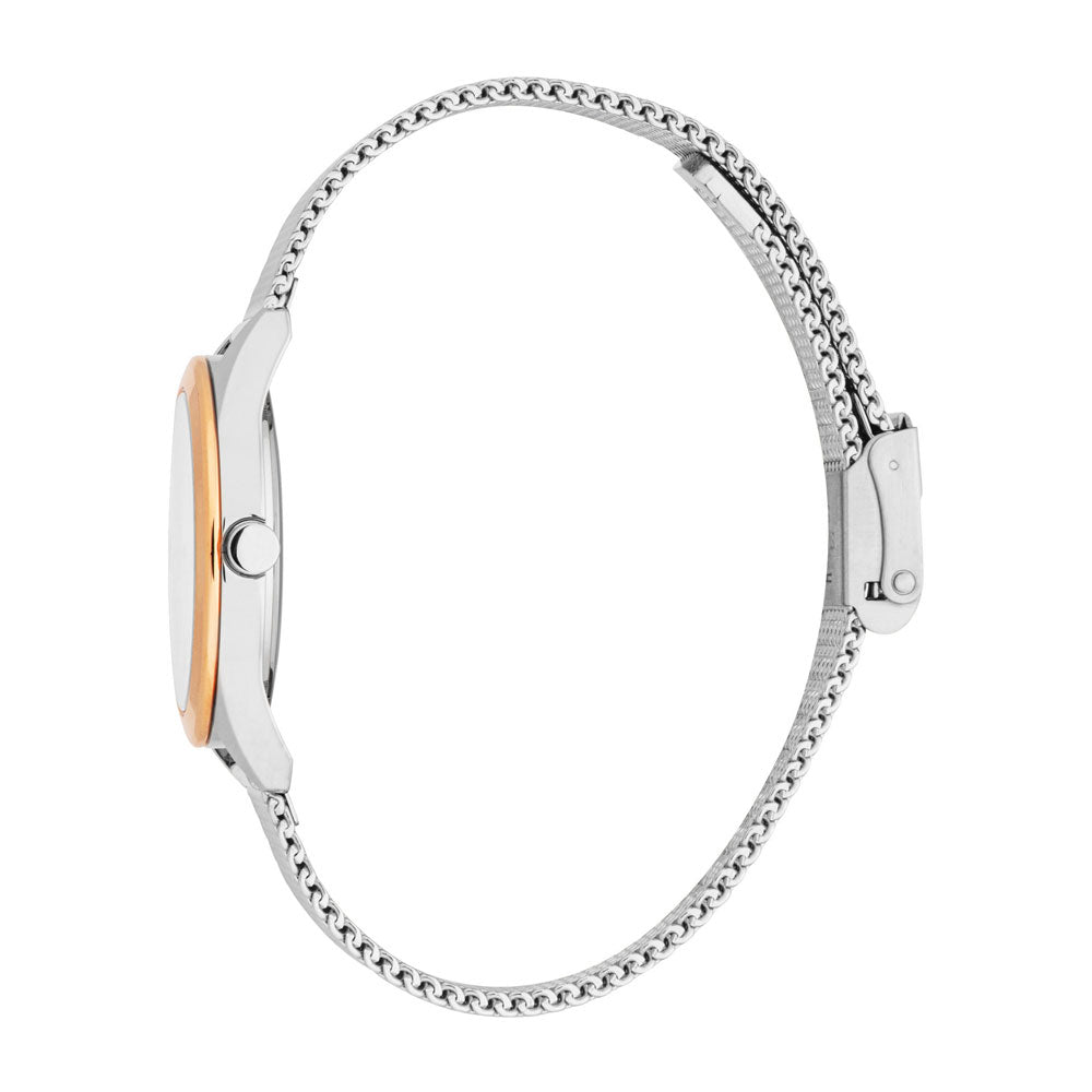 A captivating fusion of classic and modern aesthetics. The timeless silver dial meets the elegance of a silver strap, while the rose gold bezel adds a touch of sophistication. Elevate your style with this chic timepiece, effortlessly balancing timeless grace with contemporary allure.