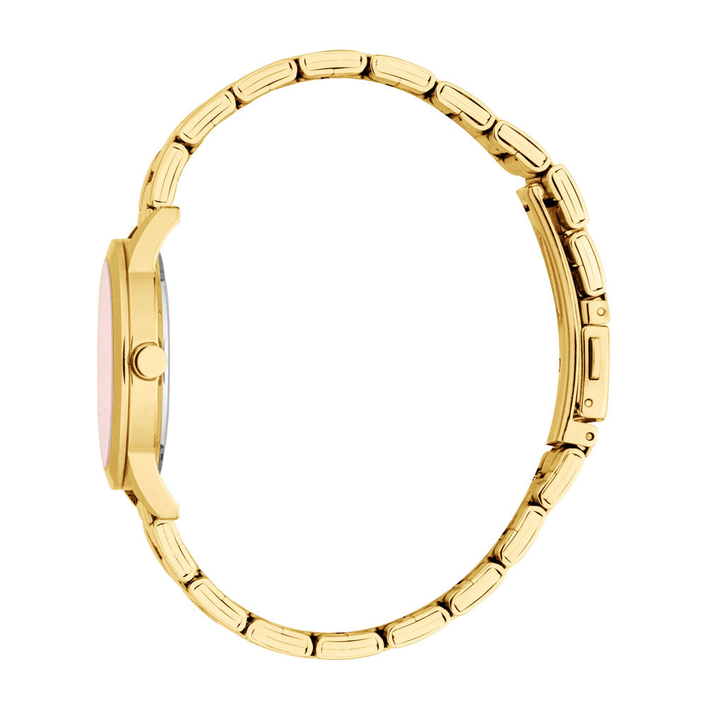 Captivate with a touch of romance on your wrist. Our stunning timepiece boasts a delicate pink dial, a subtle hue that echoes sophistication and charm. Paired with a regal gold strap, this watch is a fusion of elegance and warmth, ensuring your style radiates grace and timeless beauty. Embrace the allure of every moment with this exquisite combination of color and luxury