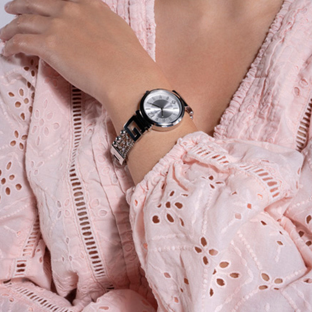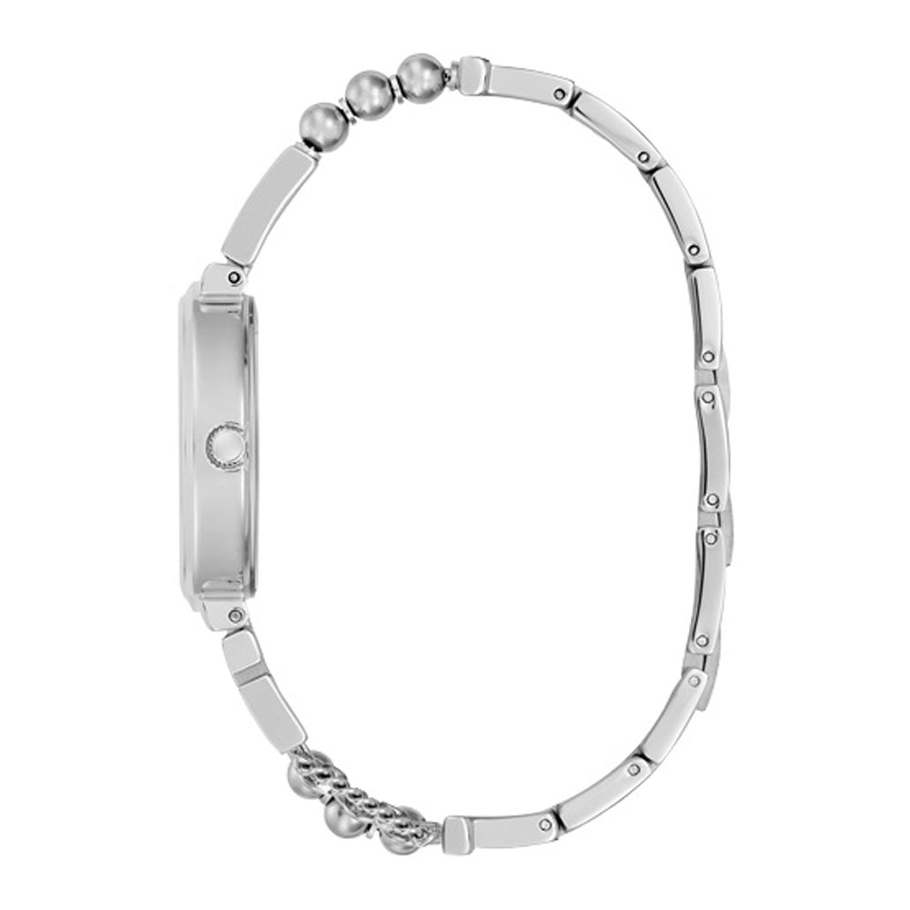 This silver tone timepiece is perfect for any woman who appreciates fine jewelry and sophisticated accessories. The daring design is highlighted by a unique stainless steel bracelet embellished with crystals.