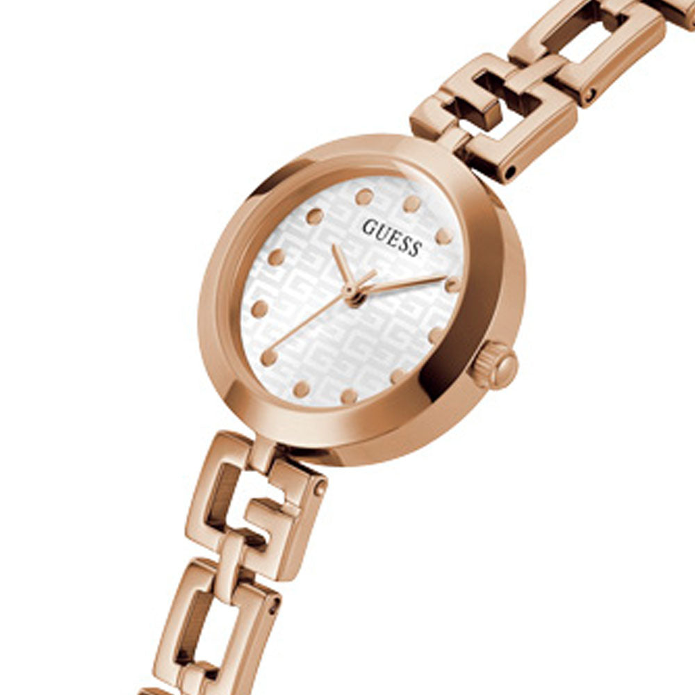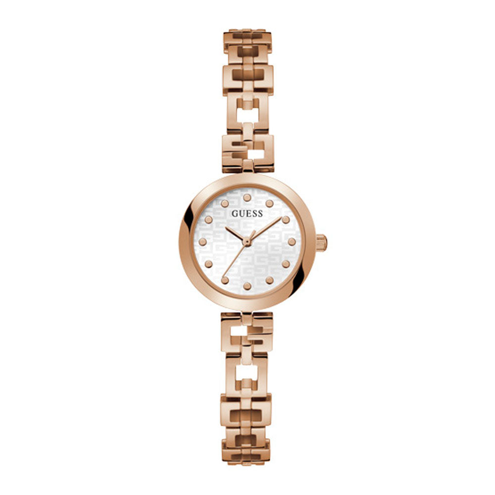 Make a small statement with this petite rose gold-tone watch, which features a square G logo pattern on the analog dial and minimalist hour markers. Completed by a square link chain bracelet.