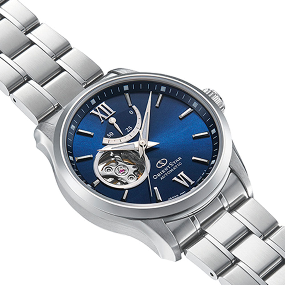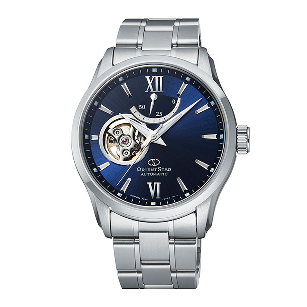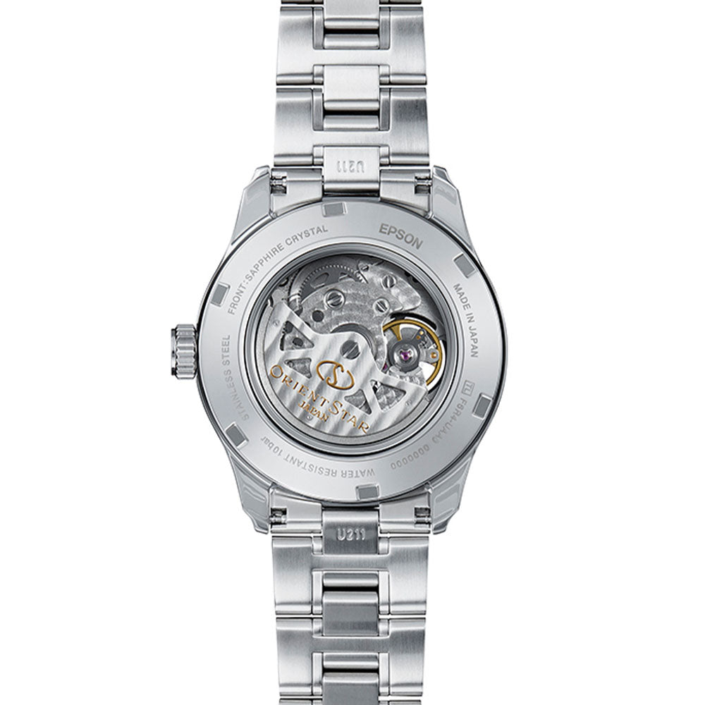 Our premier ORIENT STAR line features this striking 39mm stainless steel mechanical watch, alluring hands with luminous accents and a classic hand-wound crown with automatic self-winding functionality.