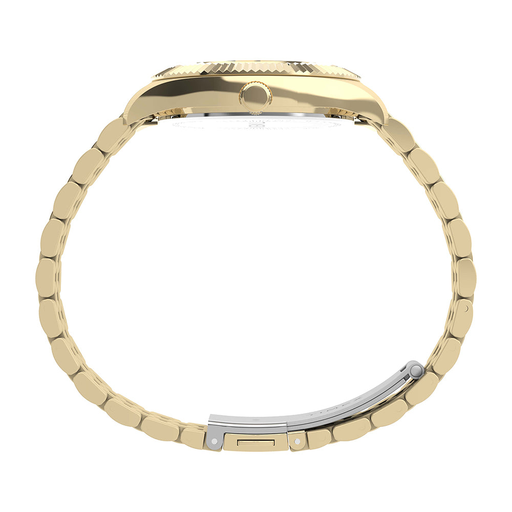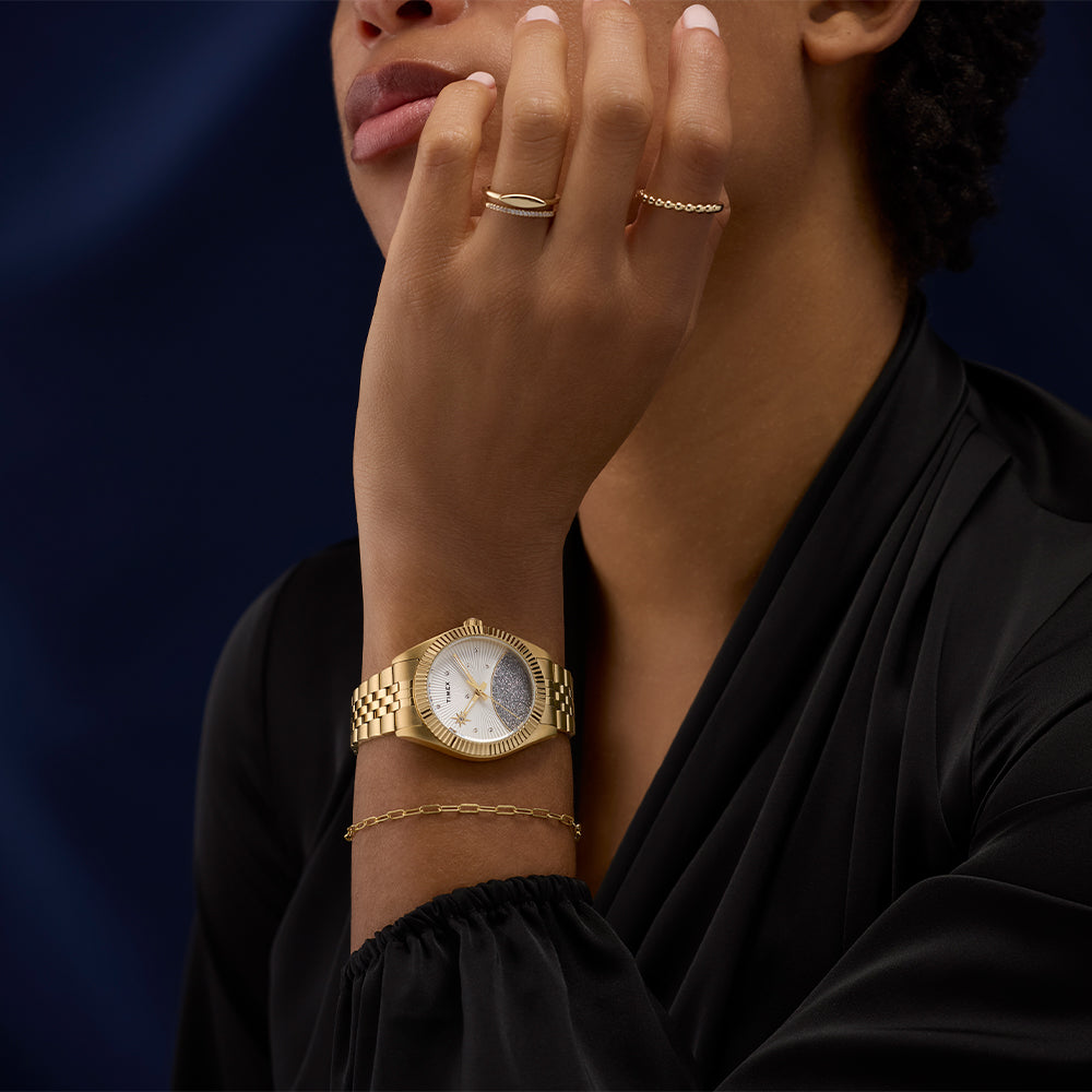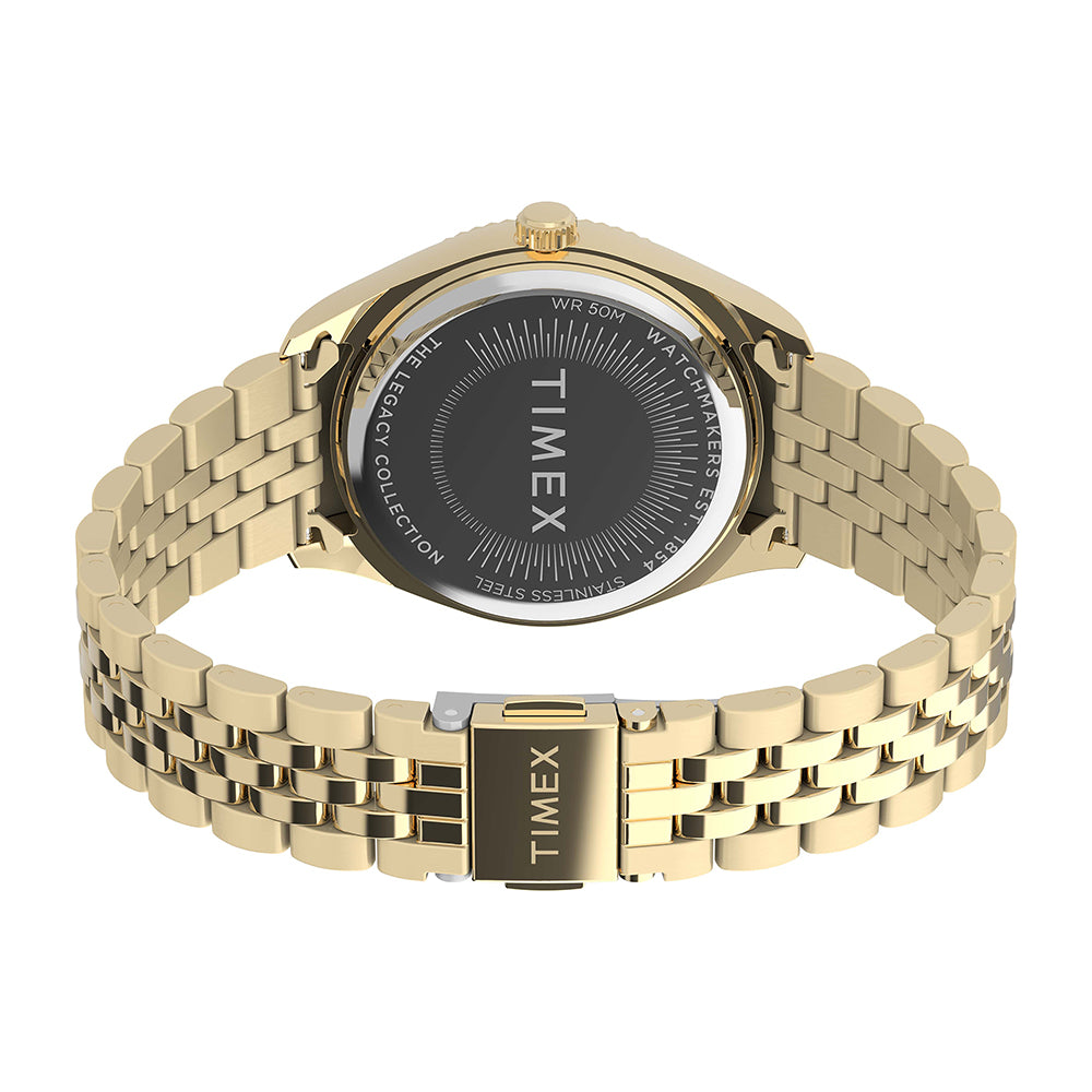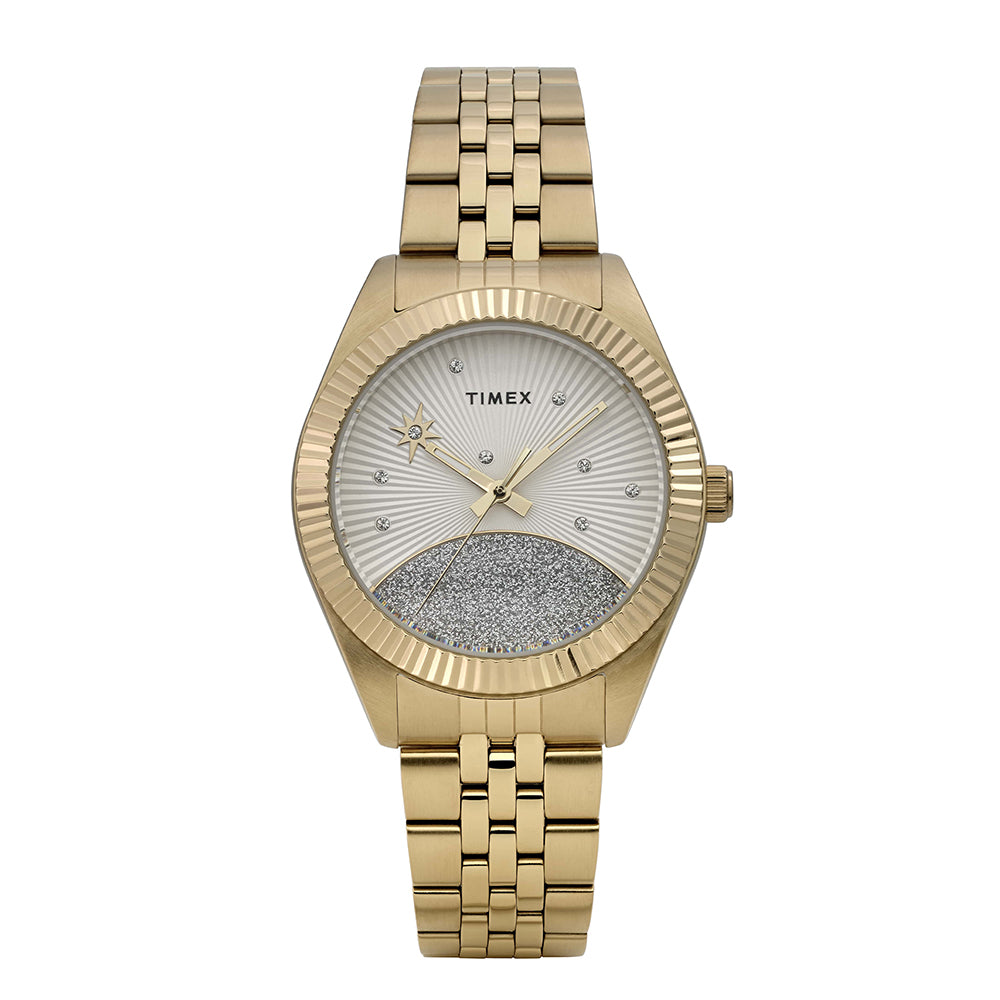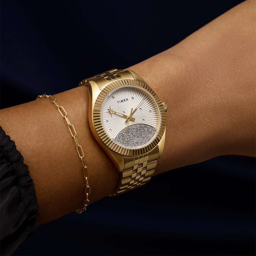 Our Celestial Timex Legacy captivates with unique details that bring the allure of the night sky to your wrist. Sparkling crystals scatter across the textured silver-tone dial and combine with a customized second hand to create a design that rivals the stars themselves, while the brushed and polished 36mm gold-tone stainless-steel case and coordinating brushed and polished stainless-steel bracelet offer a contemporary look you’ll love to wear.