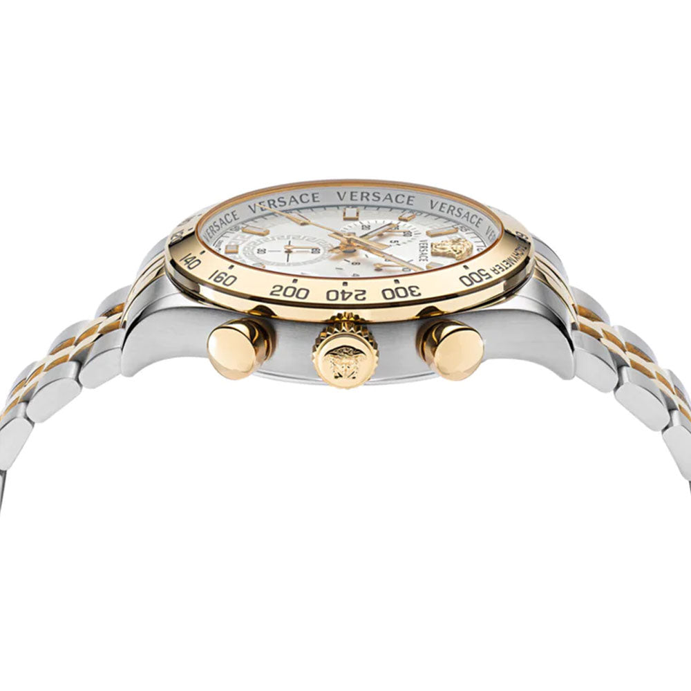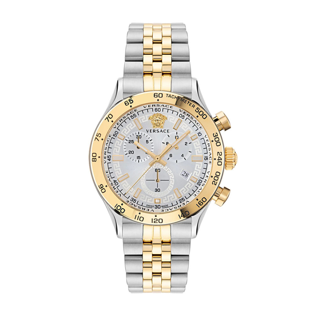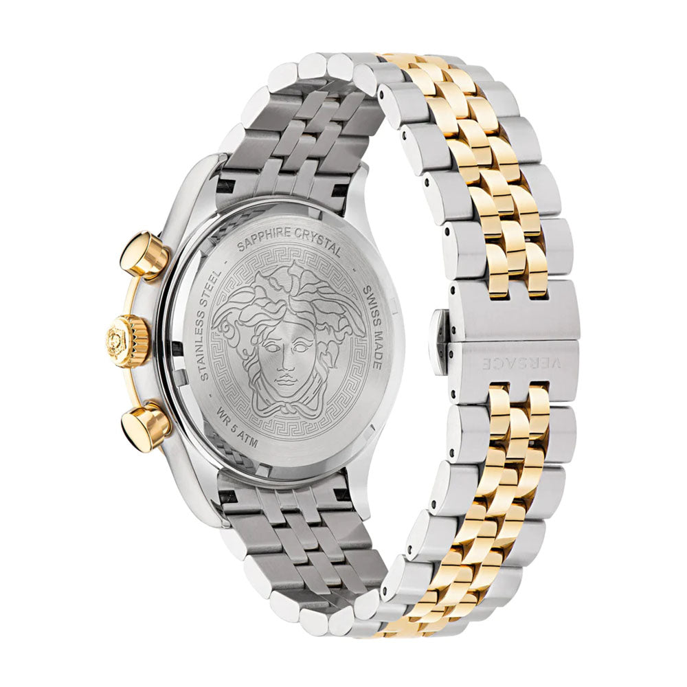 A new version on the well-known Hellenyium is now proposed. This bold 44mm case is a mix between a sporty and chic watch. The iconic and ever green collection is now presented with a chronograph movement with 3 counters that enrich this precious dial. _x00B_In addition to this, the Greca embellishes the outer dial and at 12h stands the fierce Medusa head. To flag, the genuine calf leather strap with canvas, for a new sport-luxury concept.