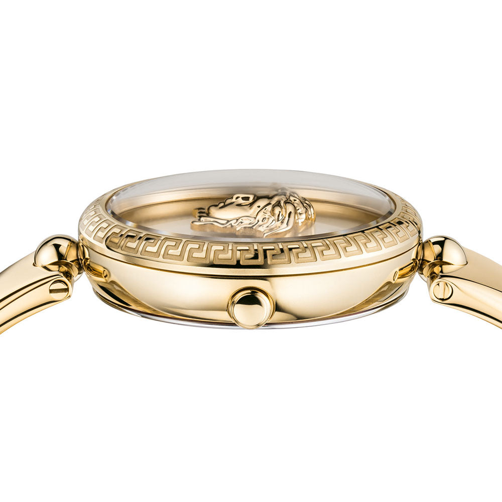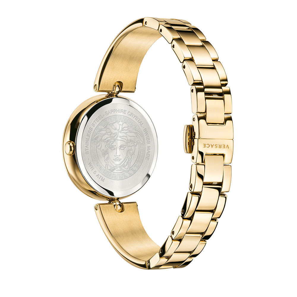 The iconic style remains unchanged: the central Medusa icon takes center stage, tone-on-tone Greek key engraving decorates the bezel, and the guilloche sunray dial tone matches the semi-bangle bracelet in a jewellery inspired version.