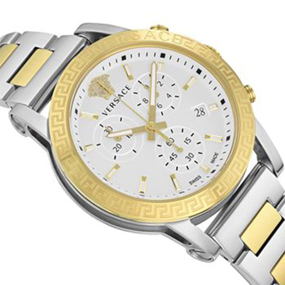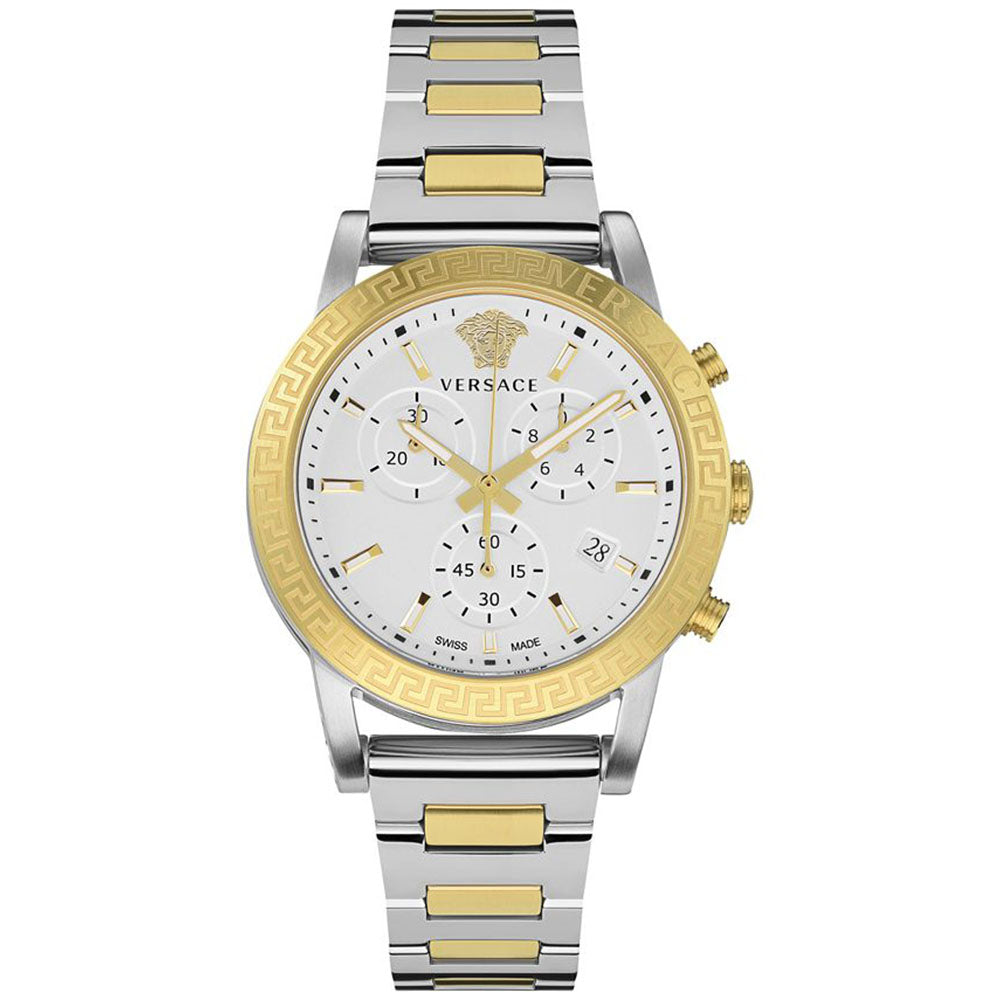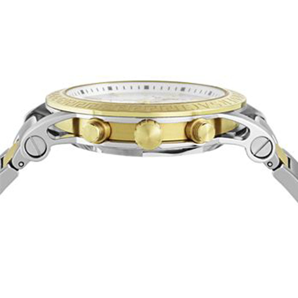 A new iconic and bold watch that rediscovers the beauty and the charm of the Versace brand dna. This sporty ladies watch is empowered by the Medusa at 12h, la Greca engraved of the top ring and Versace lettering at 2h. The watch hosts a chrono movement with 3 counters.