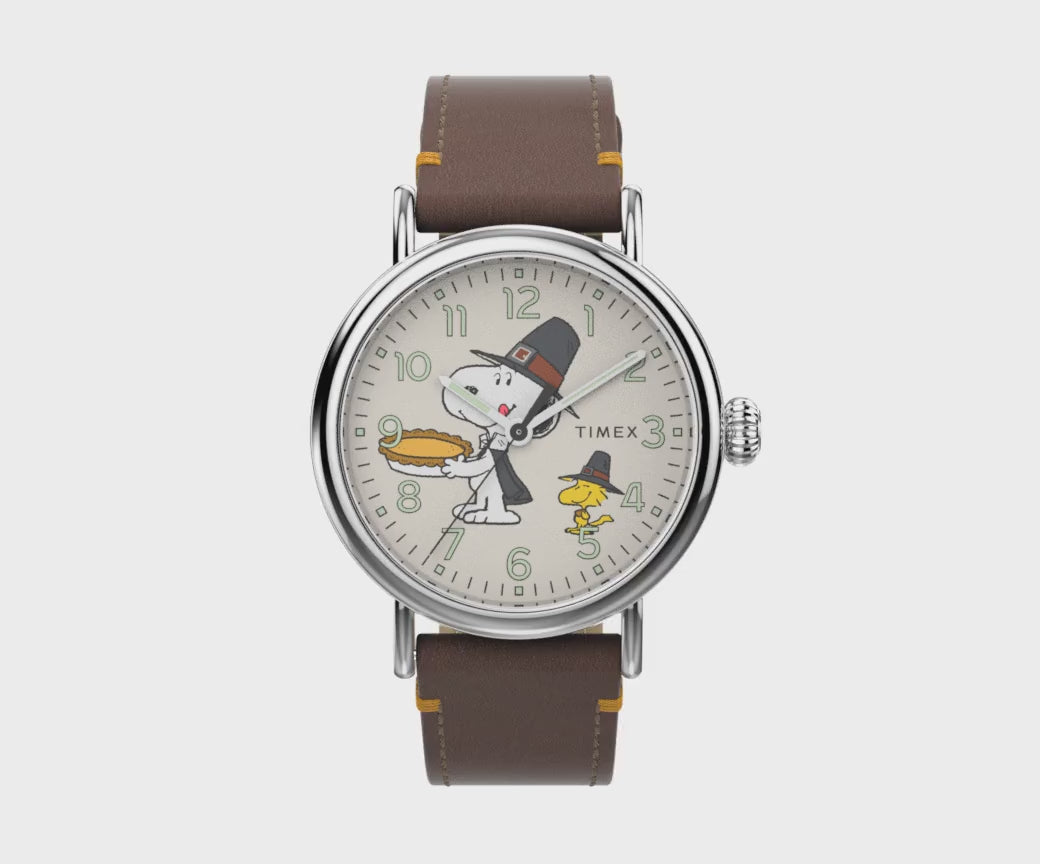 Give thanks for friends! Our most refined everyday watch meets our favorite Peanuts beagle. We updated our versatile Timex Standard pairing the silver-tone case and brown leather strap with our pals Snoopy and Woodstock dressed as pilgrims on the dial to celebrate Thanksgiving.