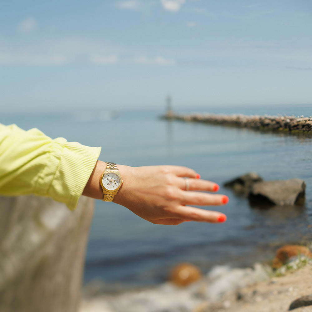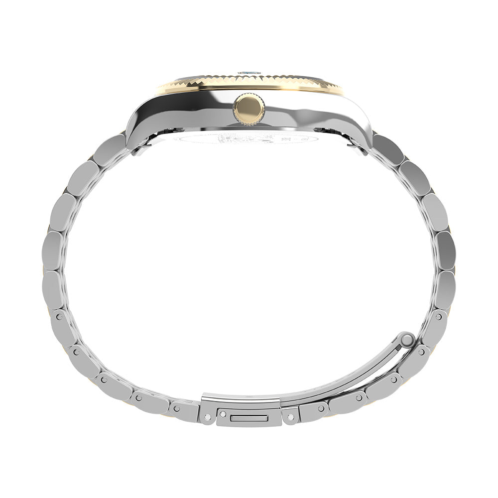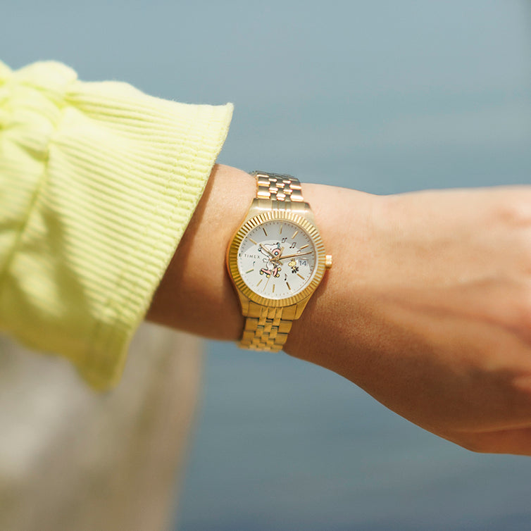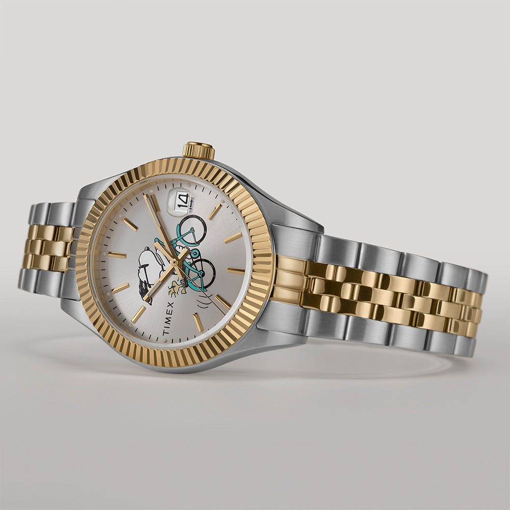 Let’s cruise! Snoopy and Woodstock cycle their way across the dial of our Timex Legacy. This playful 34mm watch is a collectors’ item just as much as it is an accessory you can wear every day, featuring a two-tone recycled stainless-steel case and bracelet. A classic construction celebrates our roots with ageless style, complemented by an elegantly fluted bezel, date display, luminant hands, and brushed silver sunray dial.