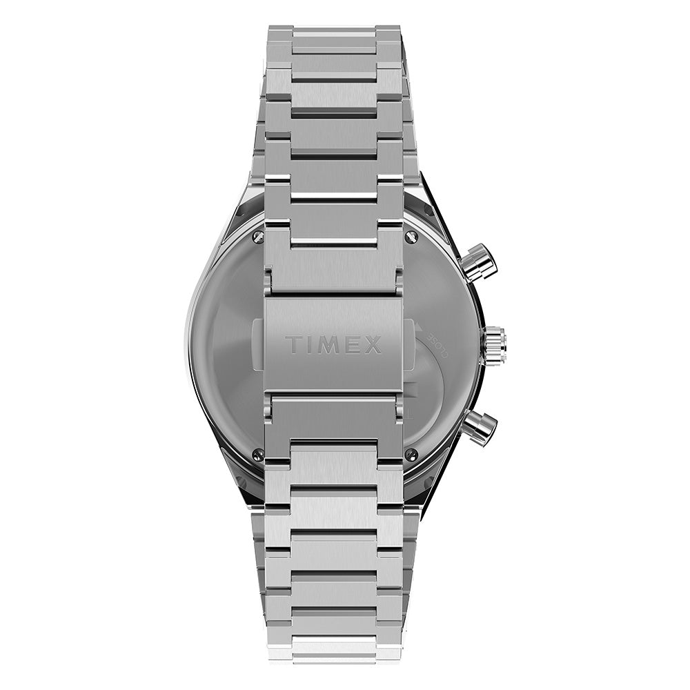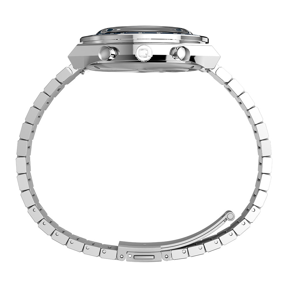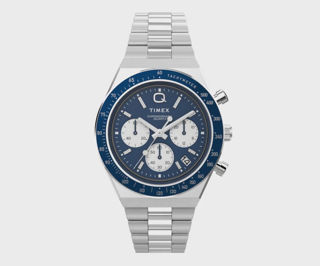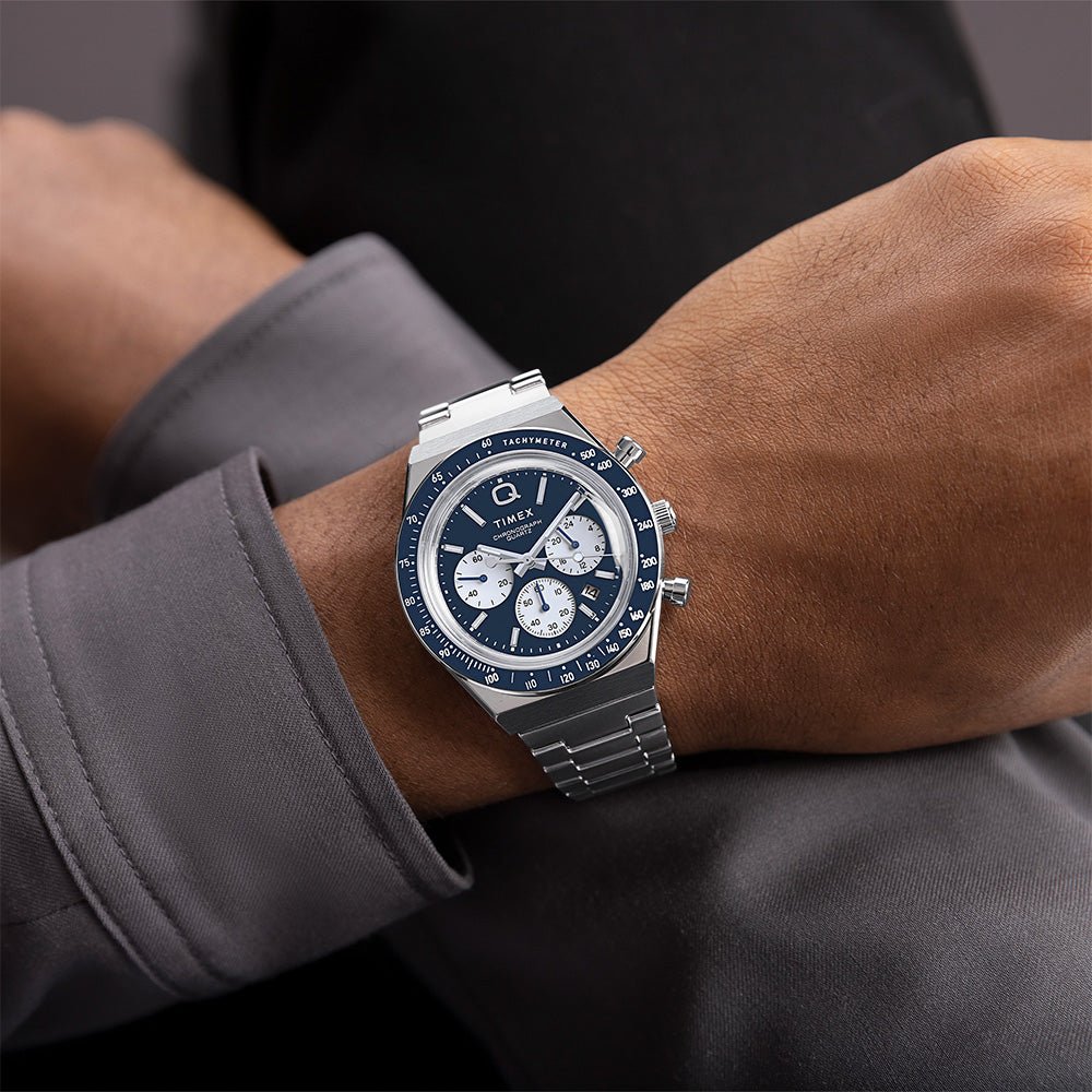 Roar across the finish line with our high-performing Q Timex® Chronograph. Inspired by the original motoring watches that graced the tracks of Europe’s most iconic races, this timepiece celebrates the endurance of our legendary 1970s Q Timex. An ultra-precise chronograph movement and tachymeter bezel recreate the finesse and function of a true racing watch, allowing you to determine elapsed time and average speed like the greatest daredevils in motorsports. Contrasting sub-dials, a date feature, hand-applied dimensional indices, and an updated Q Timex logo stand beautifully against a midnight dial, while a stainless-steel crown and brushed and polished 40mm stainless-steel case bring dynamism and durability to its retro construction. Infinitely wearable, it presents with a sleek stainless-steel bracelet.