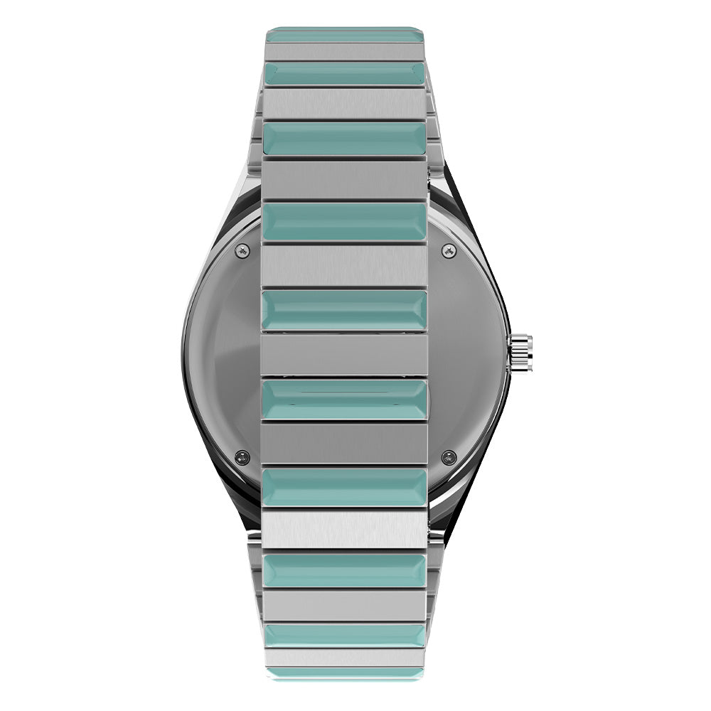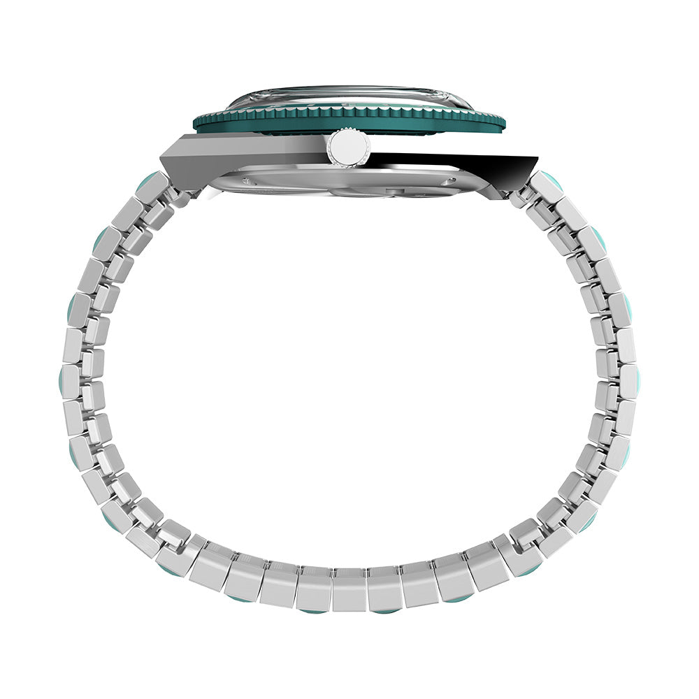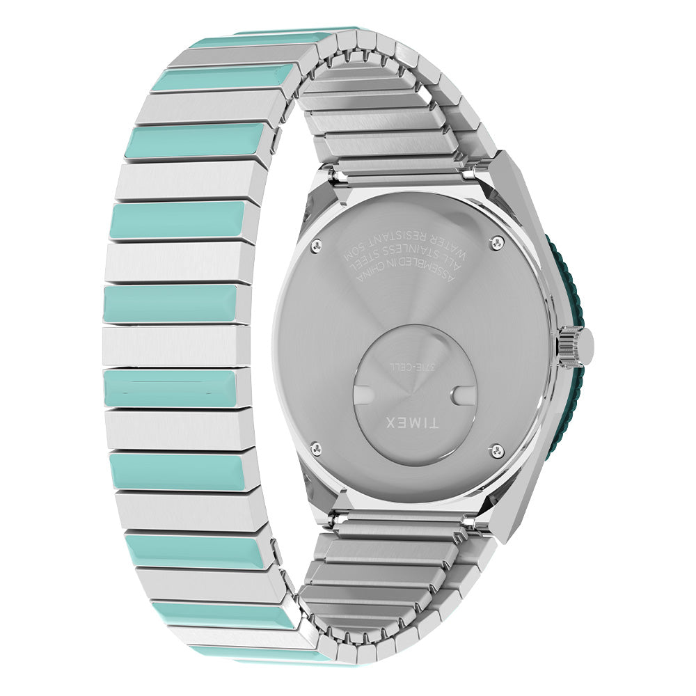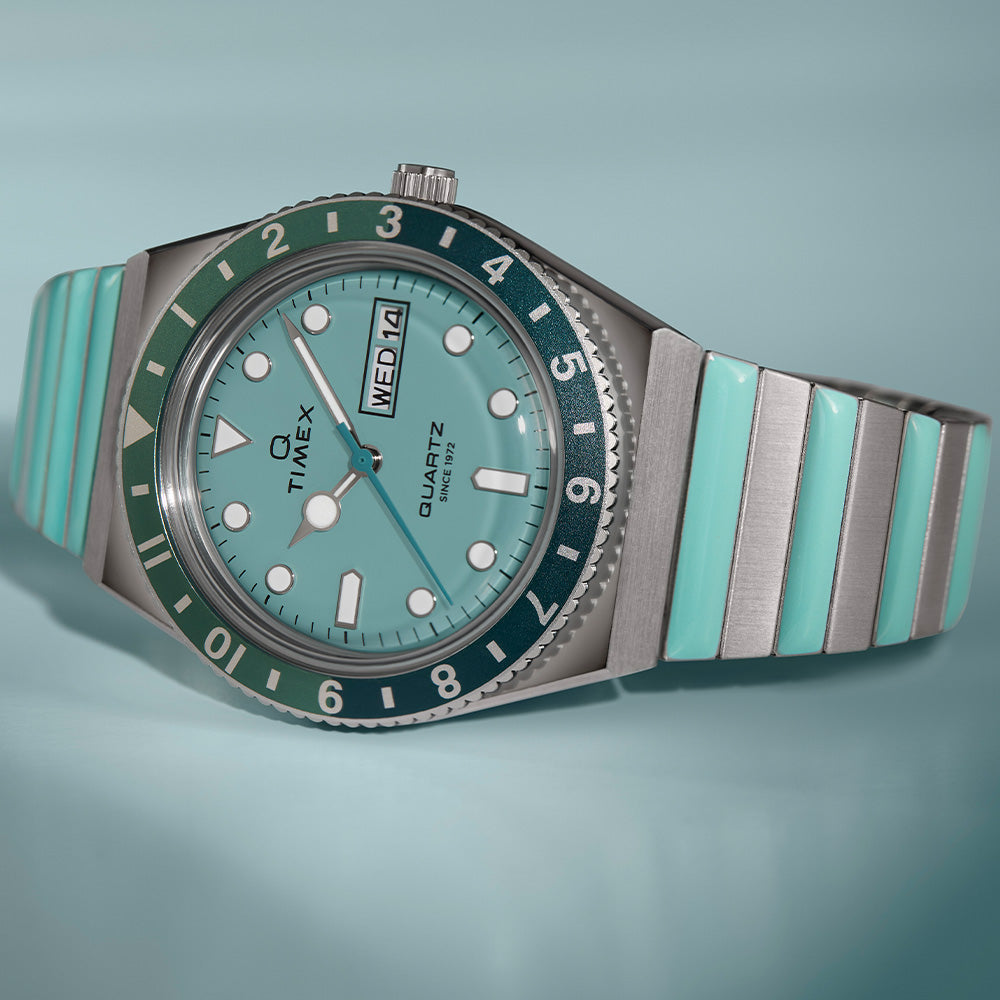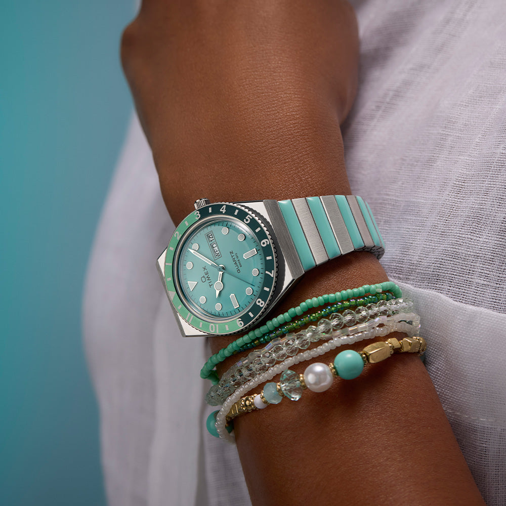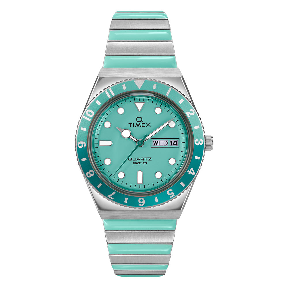 This fresh update to our Women's Q Timex offers a soft pastel colorway, with the dial, bezel, and brushed stainless-steel Perfect Fit expansion band featuring sweet shades of aquamarine. Other details include all you’d expect from our Q – a bidirectional rotating top ring, day of the week and date window, bold hour markers, and domed acrylic crystal.