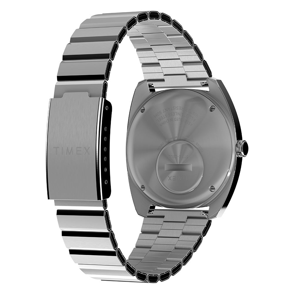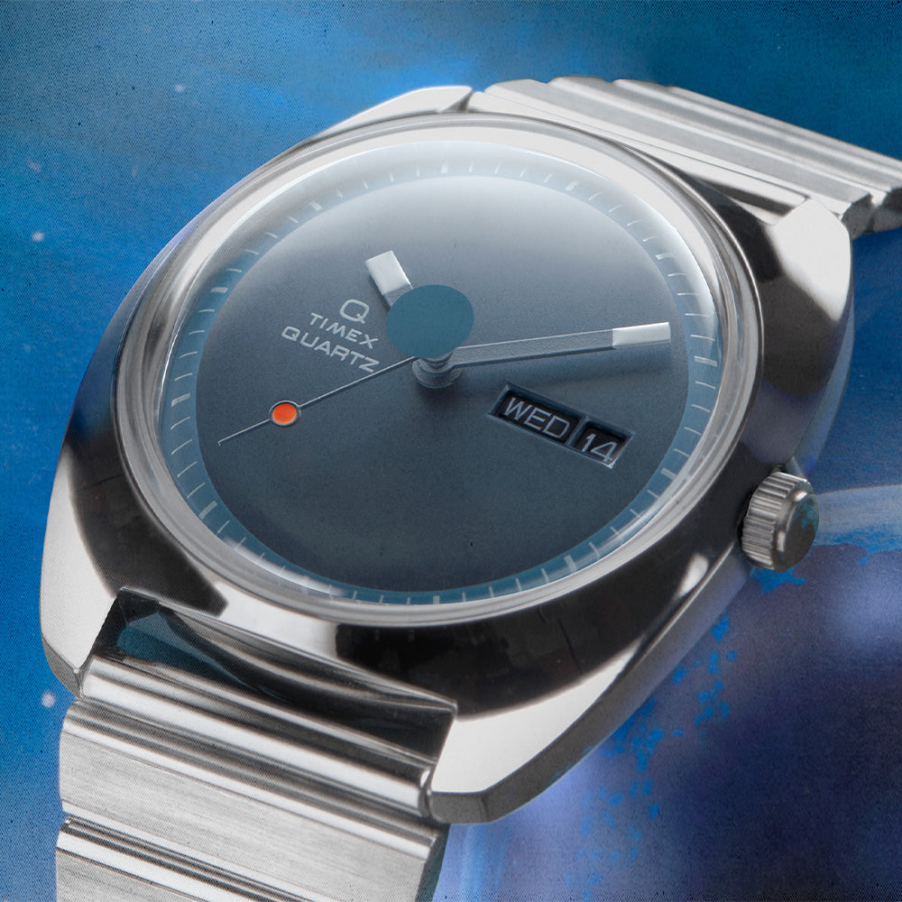 Released in 1975 and nicknamed the “Mystery Dial,” the Q Timex 1975 Enigma Reissue was originally born from a vision to craft an illusion of floating hands. A navy dot painted on the underside of the crystal cleverly conceals the main hub, while the hands—also painted navy blue—seamlessly blend with the dial to enhance the illusion of their red and white details mysteriously floating. Completing the sleek build of this modern-day reissue is an ultra-precise quartz movement, a stainless-steel case in an elongated cushion shape, a brushed stainless-steel bracelet, day and date window, and a domed acrylic crystal that brings depth and dimension.