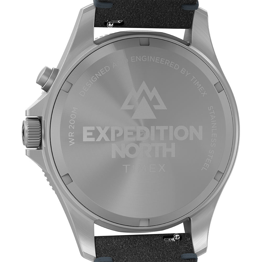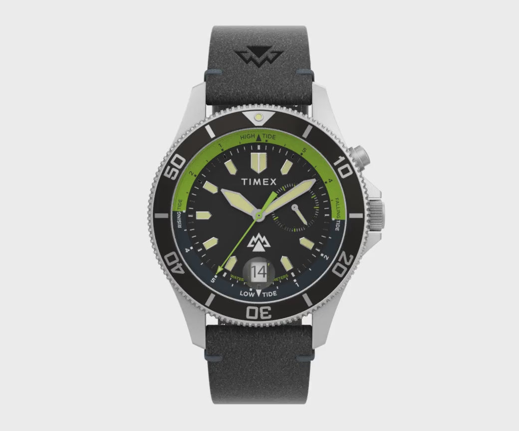 Time and tide wait for no man. Luckily, the Expedition North® Slack Tide keeps track of both. Crafted with our seafaring folk in mind, this timepiece has 200m of water resistance and a uni-directional rotating top ring, although it?s the easy-to-set tide tracking function that?s really at the helm of the design. Indicated on the dial with a green hand, this unique component tracks the ebb and flow of the local tide for any location on earth, taking the guesswork out of coordinating your next surf or sail. A 41mm stainless-steel case guarantees durability, and a mineral crystal with date magnifier ensures optimal visibility. Combine this longevity with a waxed leather strap, and you have a timepiece you can rely on wherever the current takes you.
