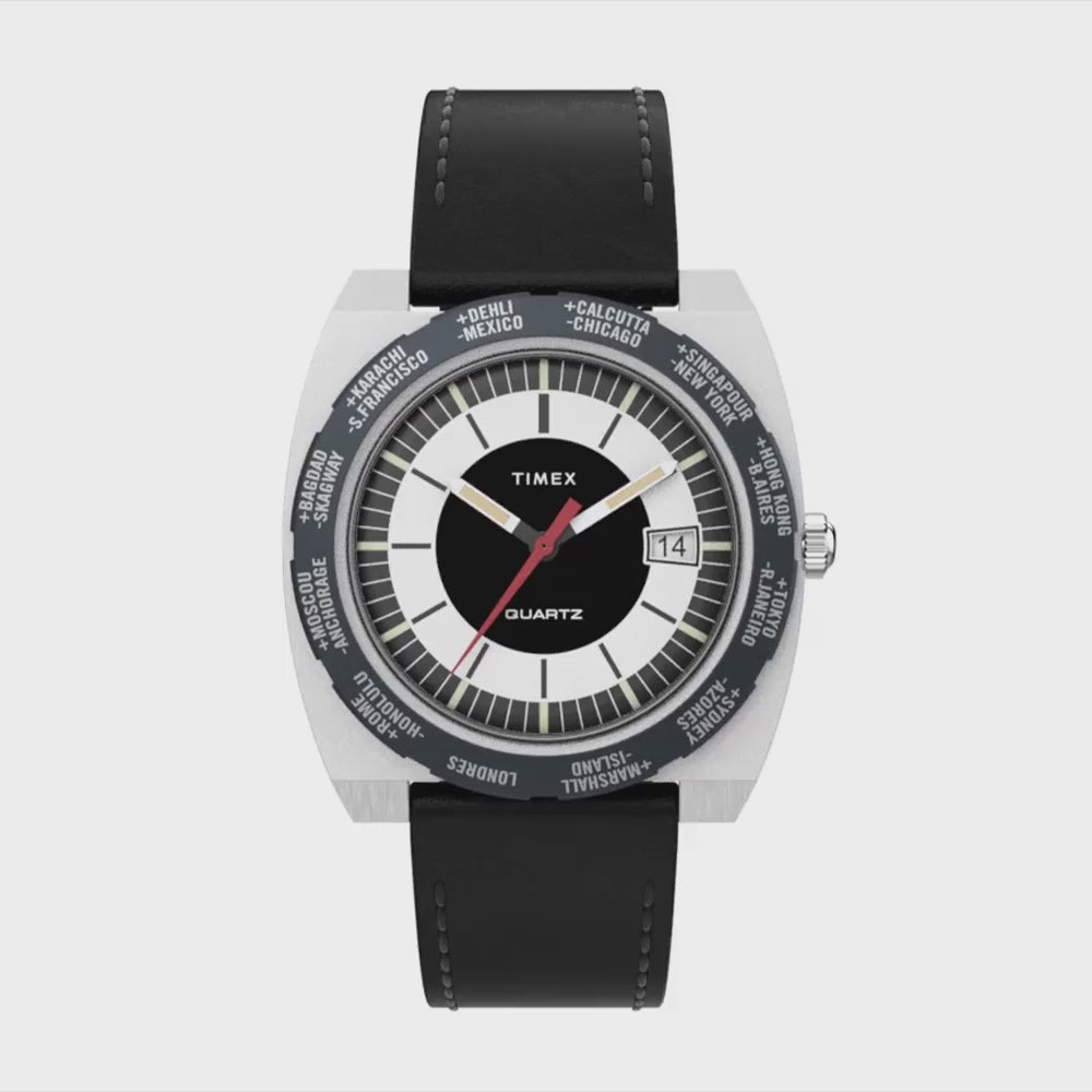 The Timex World Time 1972 Reissue brings a unique 1970s design from the Timex archive back to life for 2023. Originally created for stylish travelers in the golden era of jet-setting, its rotating bezel marks Greenwich Mean Time and follows with names of 23 cities around the globe, making it easy to read the time in any time zone at a glance. This style, created for the European market, features the French spelling for the noted locations. Other details like a barrel-shaped case, a minimalistic dial, a geometric red second hand, and a domed crystal ? all the height of cool back in 1972 ? make this a faithful tribute the original and a stylish accessory for any modern traveler.