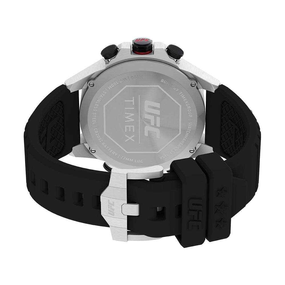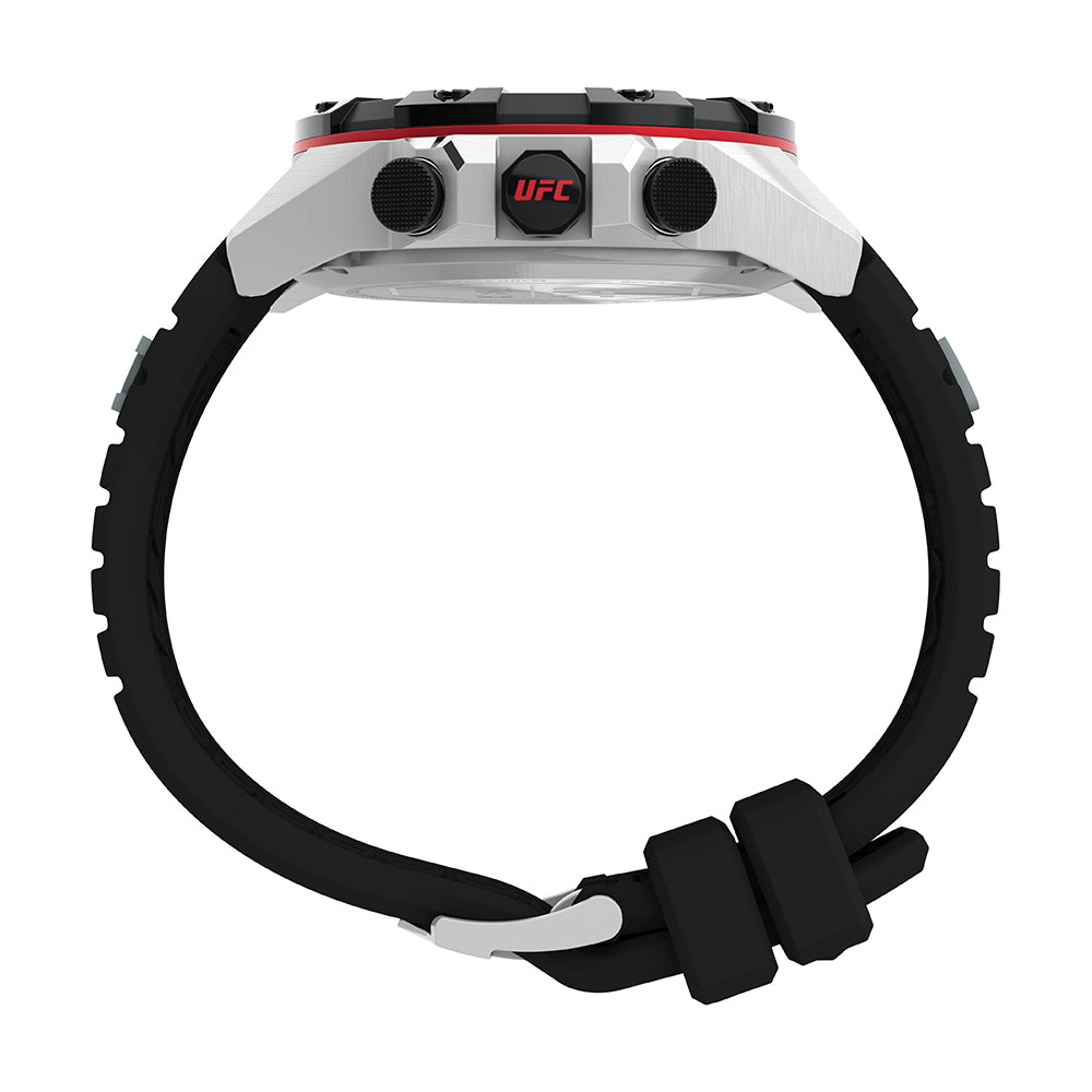 Step into the octagon with the UFC Kick Digital. This timepiece packs a punch with its substantial 49mm stainless-steel case and bezel, along with a rugged black silicone strap that's built to last. Featuring an octagonal sub-dial with alarm, split, chronograph, and AM/PM feature indicators, it?s perfect for keeping track of time whether it?s a?training or rest day. This watch is?also built with a countdown timer for timing workouts and ensuring optimal performance. Plus, it has an INDIGLO® backlight and 100m of water resistance, making it the perfect matchup no matter the time or the place.?