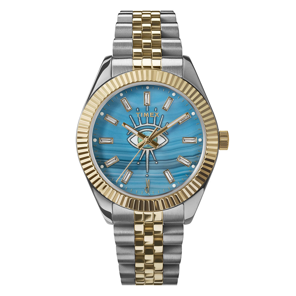 The Timex x Jacquie Aiche Eclipse collection is a reminder that even in moments of stillness and shadow, your light is always present. Designed in collaboration with ethereal jewelry designer Jacquie Aiche, this update to our Timex Legacy features a natural blue agate dial—a soothing stone that’s long been thought to promote spiritual growth. Faceted Austrian crystals mark each hour and glimmer with your every movement, while Jacquie’s signature Tribe Eye motif appears as a symbol of intuition, protection, and inner knowing. A 36mm polished stainless-steel case pairs with an elegantly fluted bezel and a matching brushed and polished bracelet to keep you shining all day long. Add it to your wrist stack as a reminder to trust that every phase of your journey is destined to bring you closer to yourself.