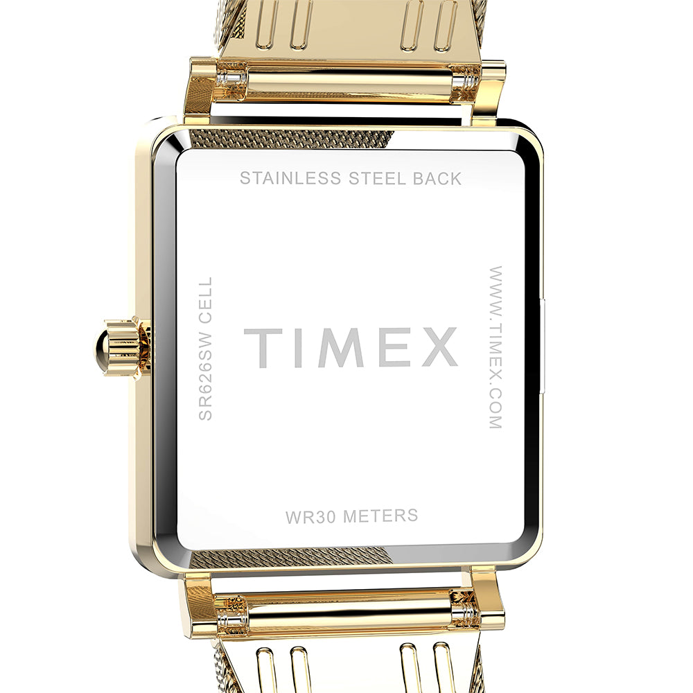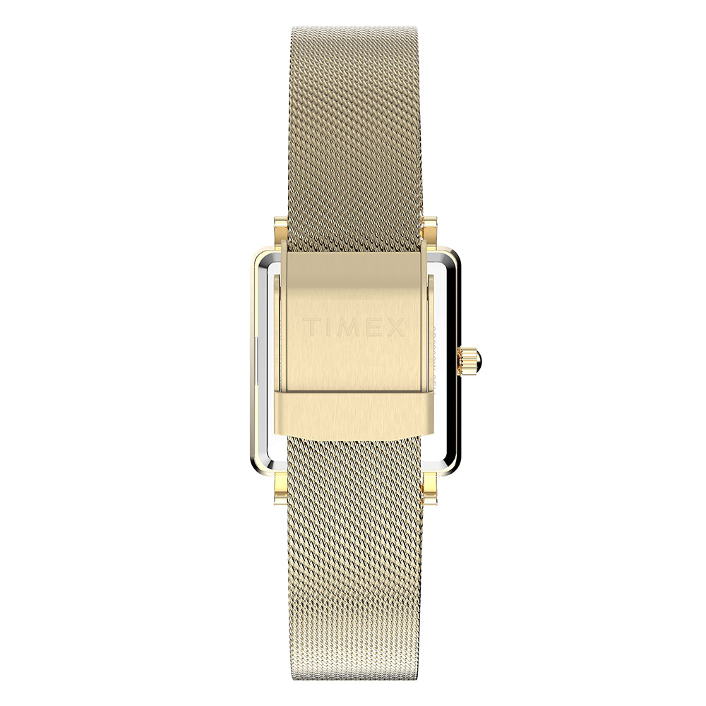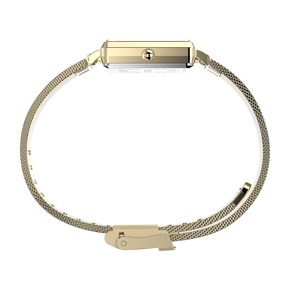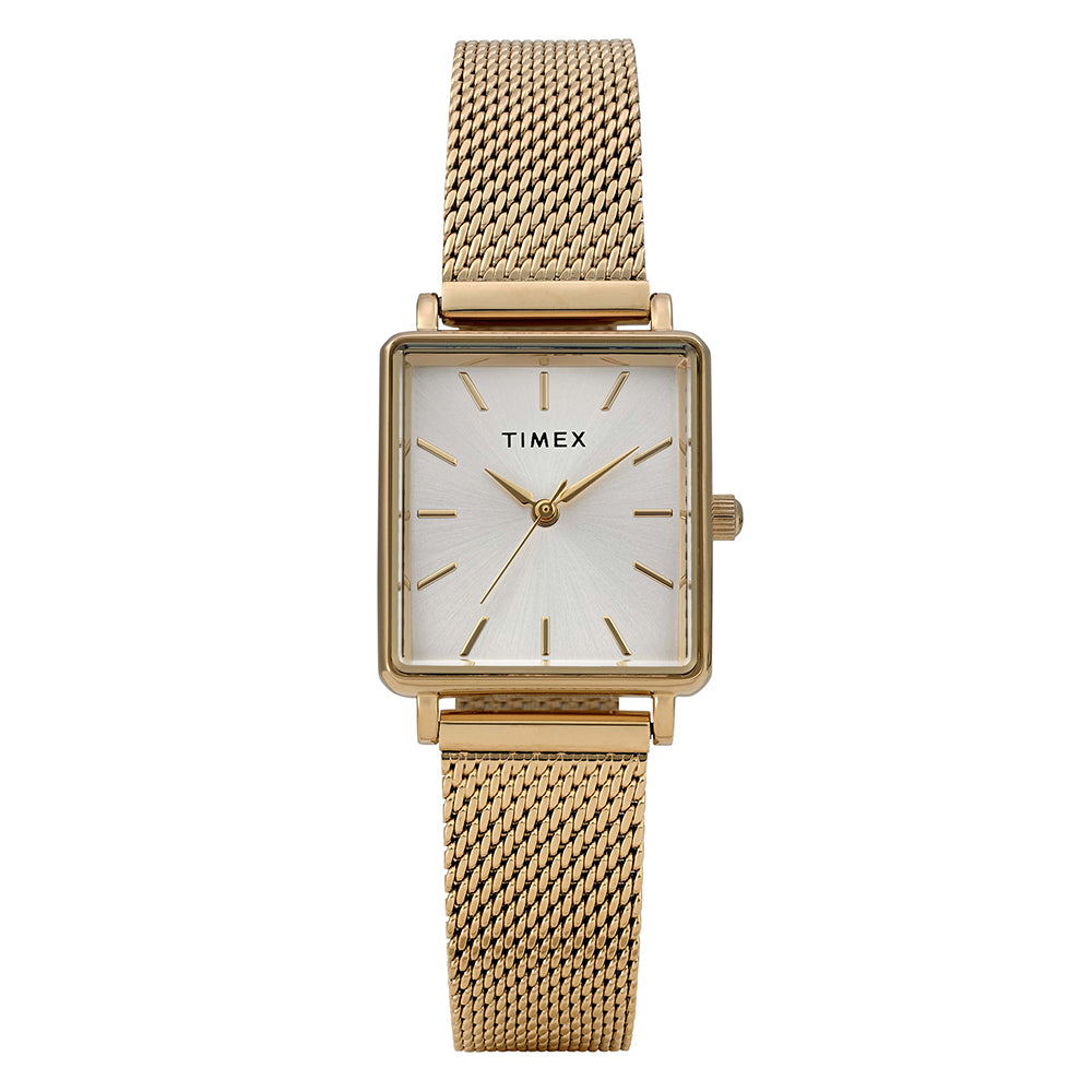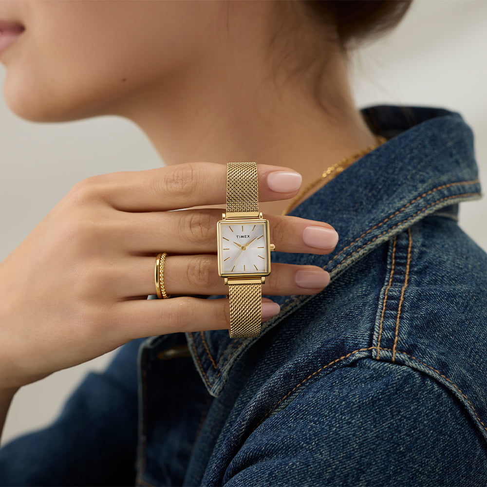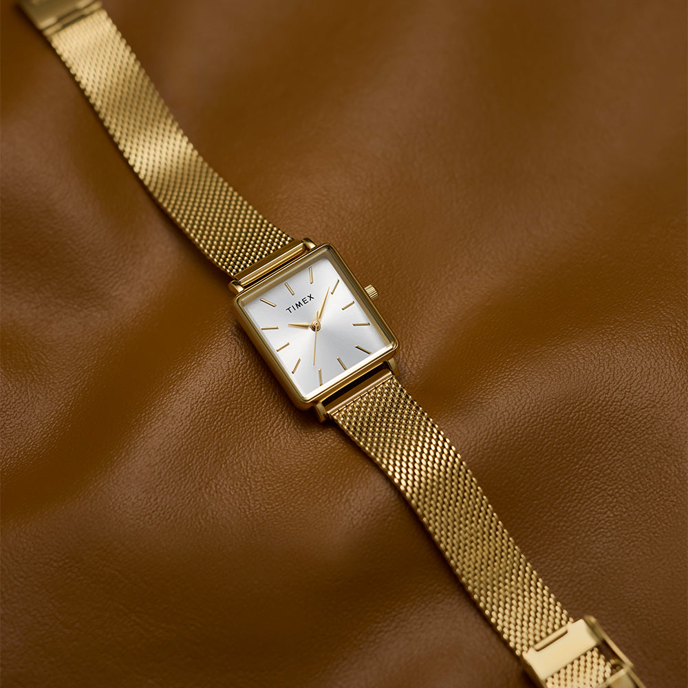 Our minimalist wristwatch, now with a fresh rectangular case for a sharper, more modern edge. All-polished finishing brings timeless elegance to the 22mm case and stainless-steel mesh band on this petite timepiece, while the silver sunray dial with alpha hands and simple markers offers a clean look you can pair with just about anything.