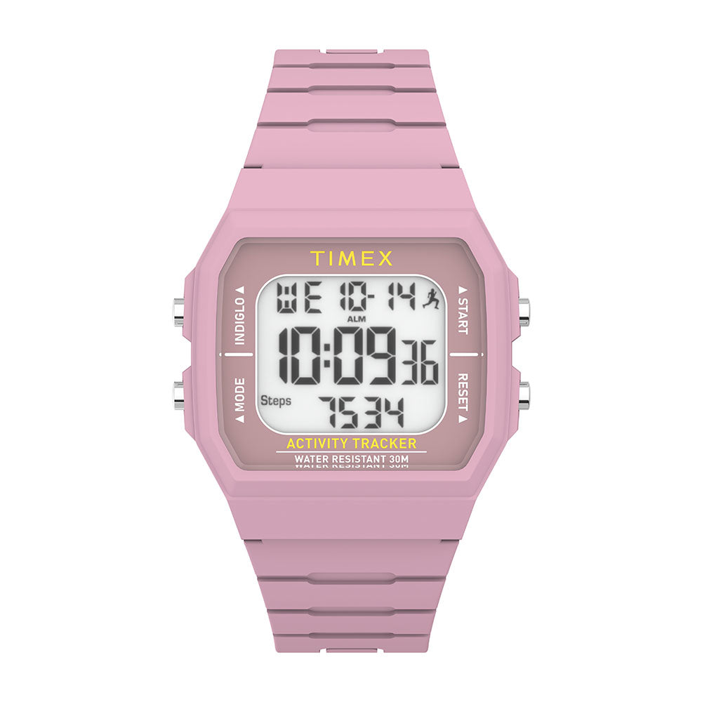 Take your wellness to the next level with the Timex Activity and Step Tracker, an easy-to-wear watcg that packs the functionality you need to achieve your personal best. Featuring a pink 40mm case and a comfortable, ergonomic strap, it's a chich and sleek companion designed to help you get the most out of every movement. We've paired step and activity tracking technology with our revolutionary INDIGLO® backlight and up to 50 meters of water resistance to create a practical pieve expertly designed for daily health management.
