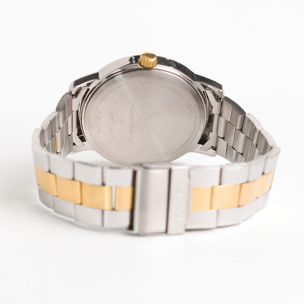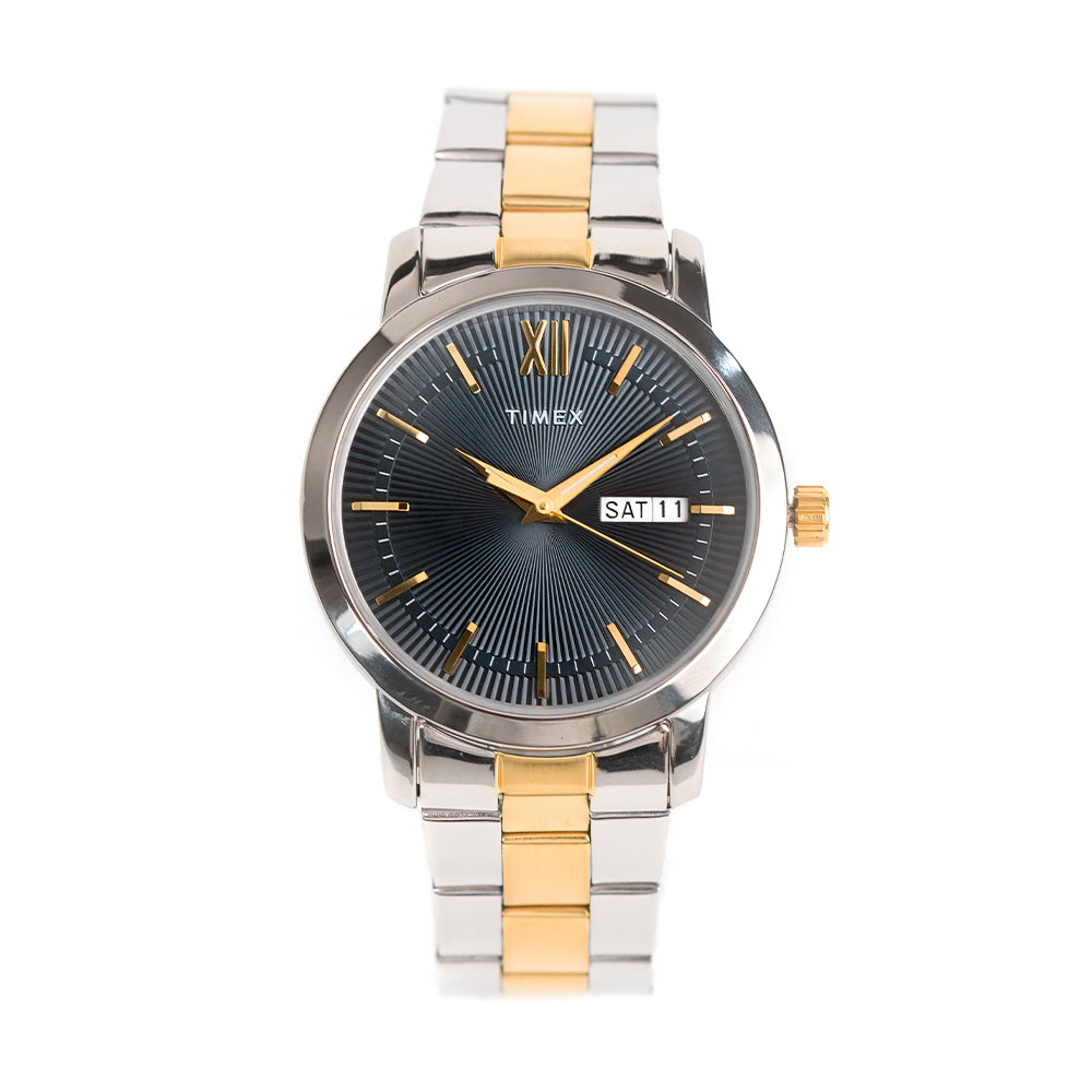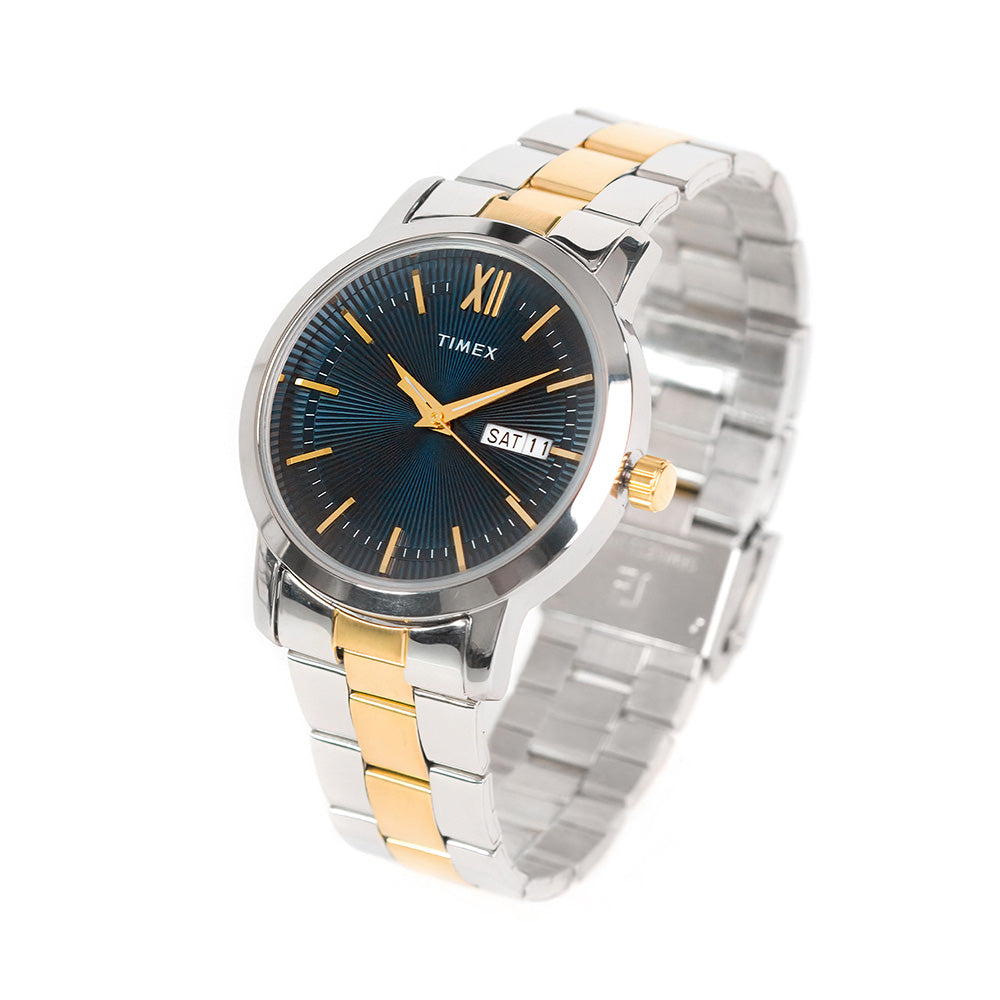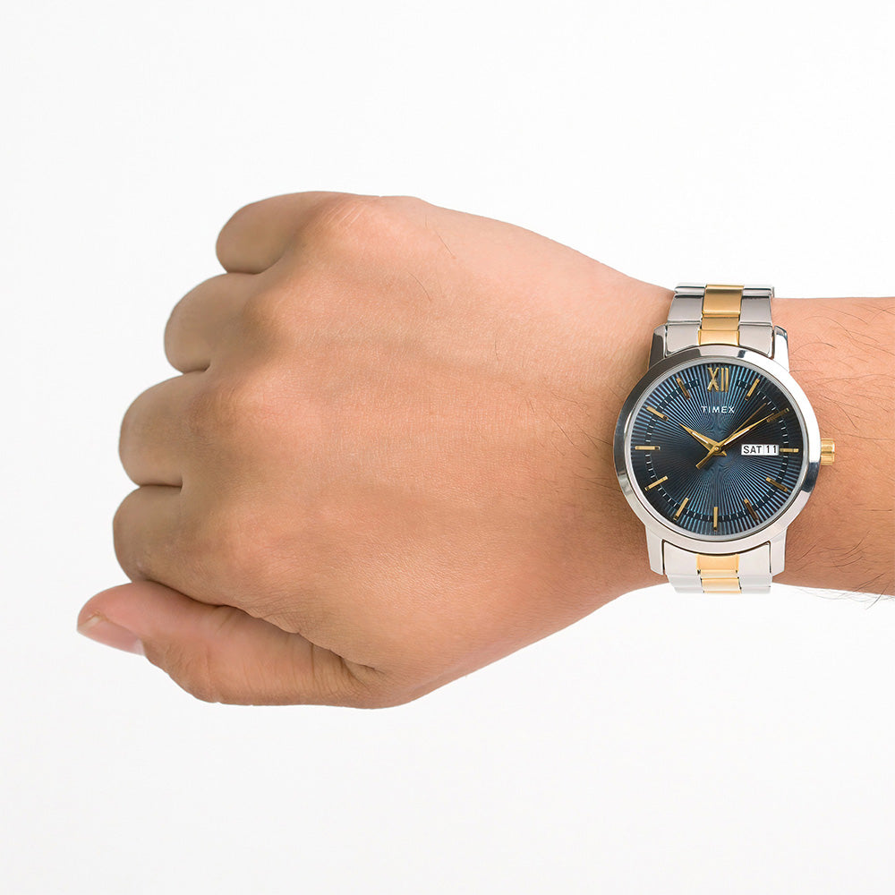 In need of a sleek timepiece with a refined edge? The elegantly-patterned blue dial gives an added touch of charm watch to the equally stunning silver-tone case design attached to a two-tone bracelet. A perfect ensemble fit for a chief executive.