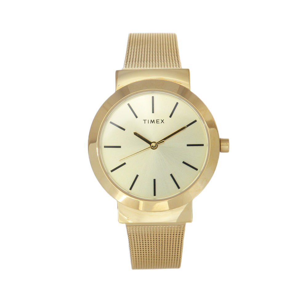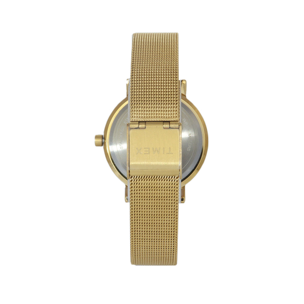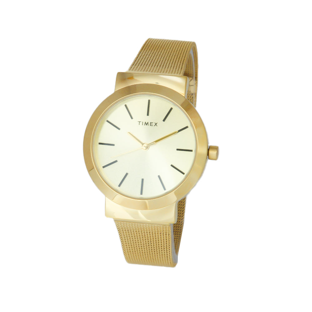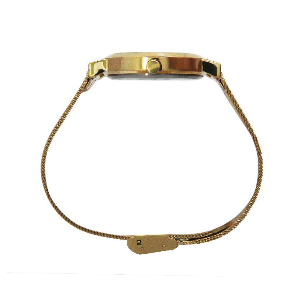 This 34mm women's gold-tone watch showcases a minimalist dial and a stylish mesh bracelet. Its modern, elegant design is perfect for the fashion-forward woman who loves versatile, everyday sophistication.
