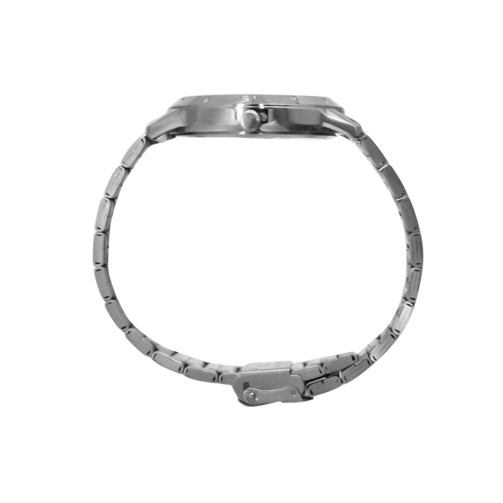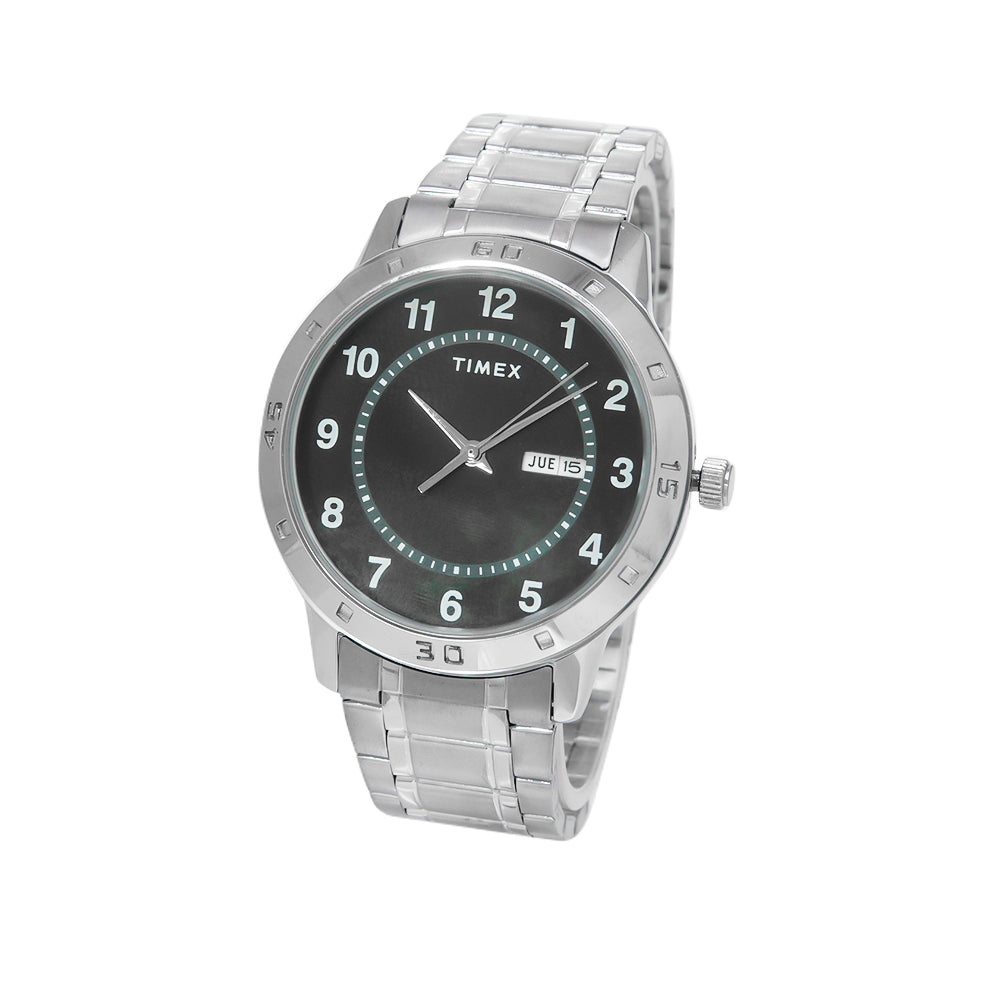 Combining rugged appeal with timeless design, this 40mm Timex boasts a silver-tone case and bracelet, and a minimalist black dial with three hands. The day and date indicator offers added convenience, perfect for an active, on-the-go lifestyle."