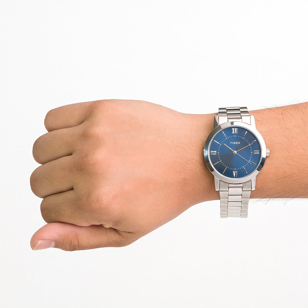 This classic analog watch for men features silver accent case and stainless steel bracelet. the functional design of the blue dial highlighting roman and line markers provides a classic and sophisticated display of the time. over-all, the stunning silver and blue accents creates a perfect balance of elegance and simplicity, that will help exude confidence to every gentleman wearing it.