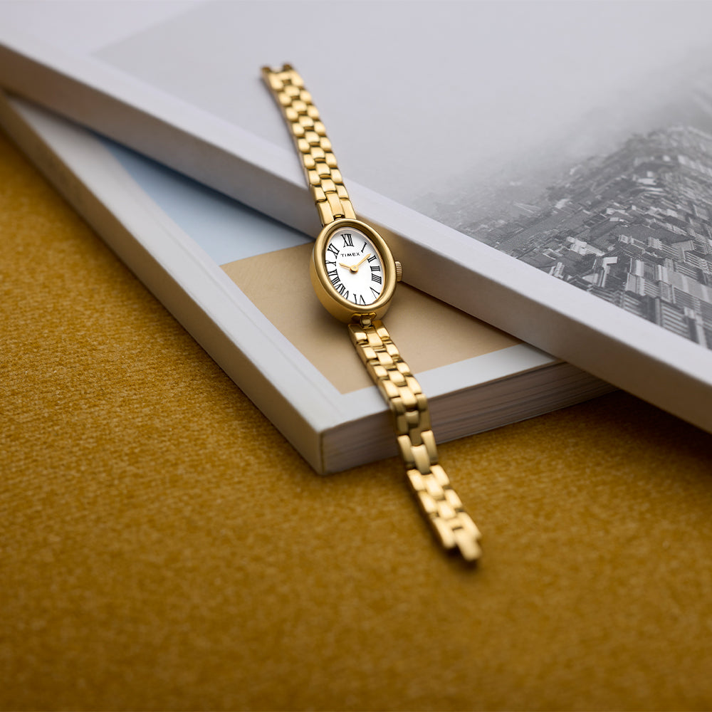 Our newly redesigned Cavatina remains faithful to its petite roots with a polished 19mm case in a classic oval shape that whispers a timeless elegance on the wrist. The delicately domed mineral crystal harmonizes with the smooth curvature of the case, while sophisticated Roman numerals grace the clean white or aquamarine dial. Completing its feminine profile is either a polished recycled stainless-steel bracelet with self-adjustable links or a more contemporary gold-tone bangle.