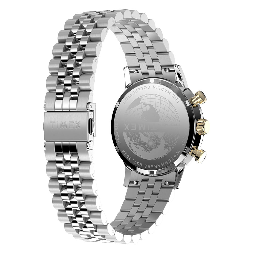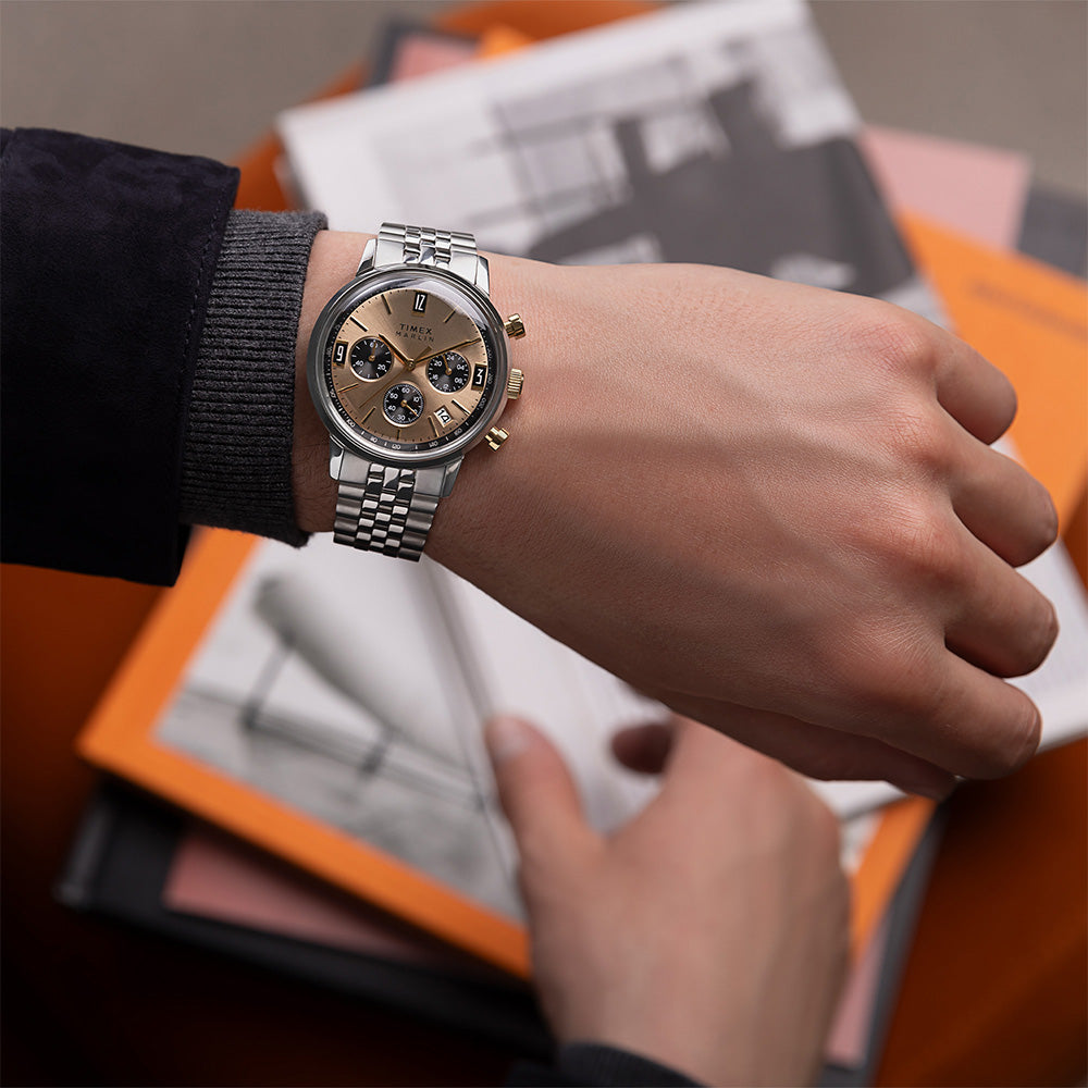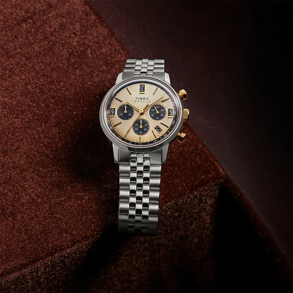 Our Marlin Quartz Chronograph Tachymeter was the first chronograph to join our Marlin line, as well as the first Marlin powered by a quartz movement. Beautifully detailed, it features a tachymeter index along its outer minute track to measure speed, as well as a unique date window placement and gorgeous gold-tone accents on its deep champagne dial. Paired with a recycled stainless-steel bracelet with quick-release spring bars. Though its build broke new ground in our watchmaking heritage, this timepiece retains the classic Marlin features with a sturdy 40mm recycled stainless-steel case, domed acrylic crystal, and retro-style applied indices at 3, 9, and 12 o'clock.